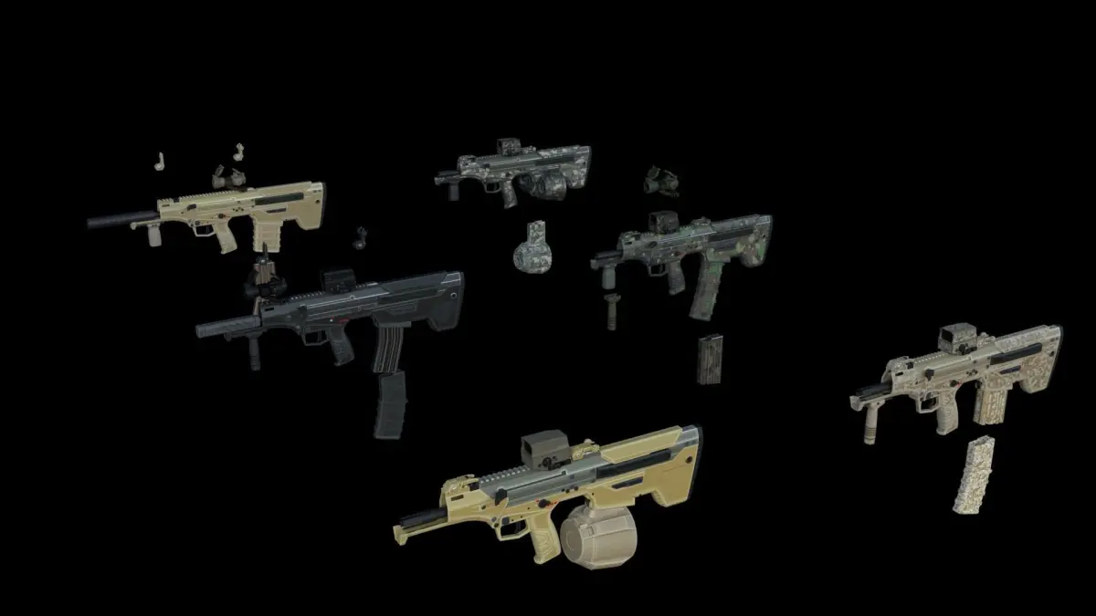 Blender: Base_Color; Height; Metallic; Mixed_AO; Normal_Open_GL; Roughness (Hurricane Holographic sight and Rhino Red Dot sight also have Opacity and Emissive maps).