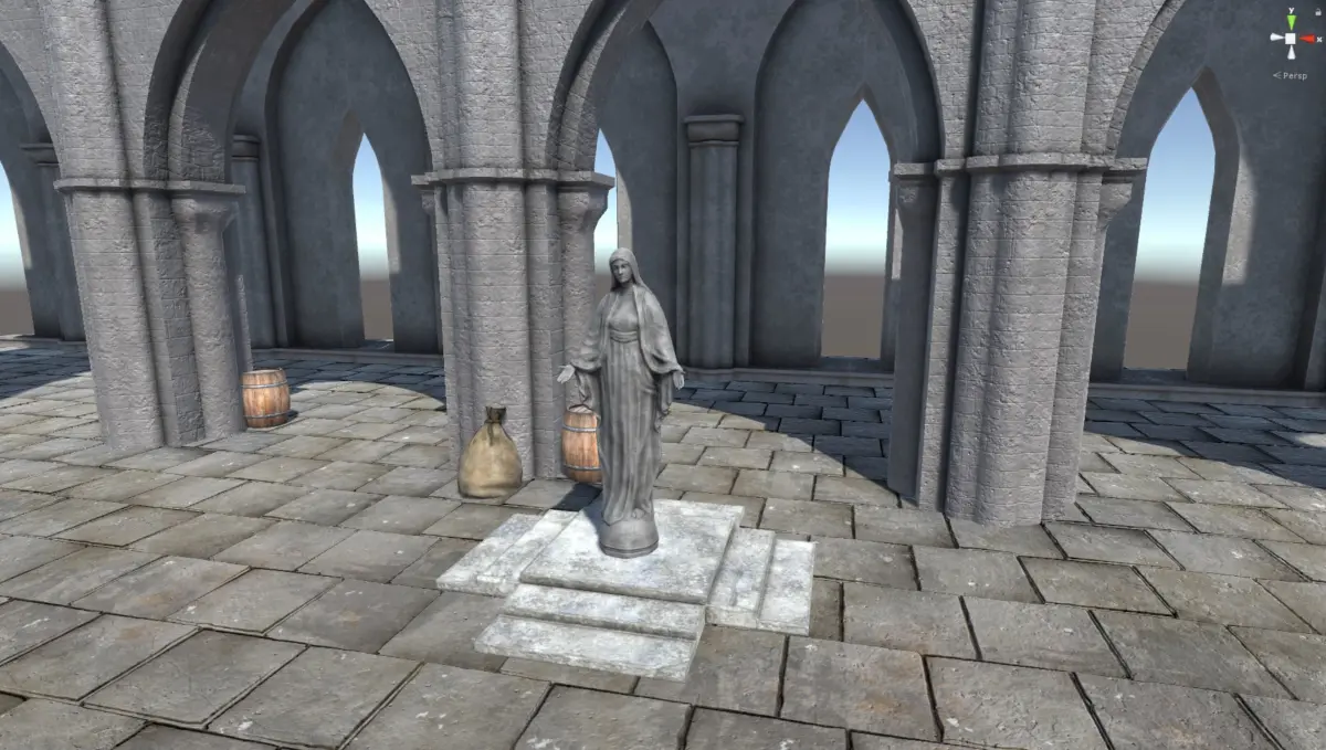 Five architecture elements that can be rotated and copied, plus four props such as statue, stand, barrel and potato sack.