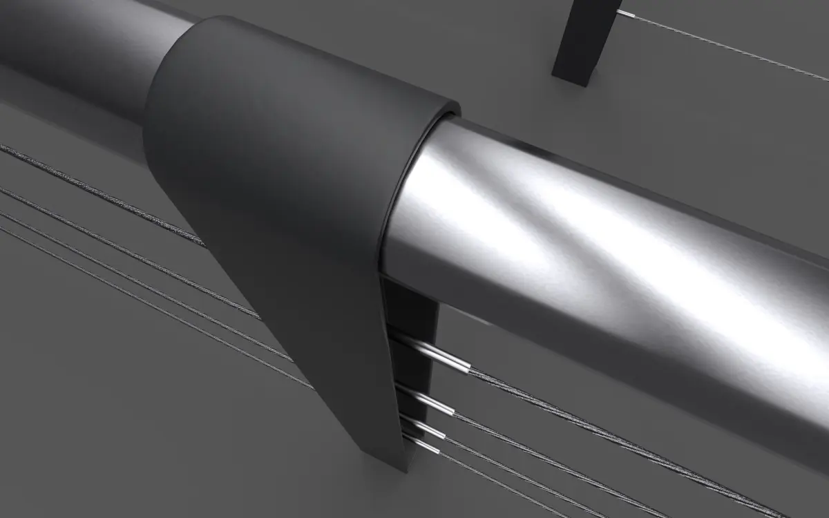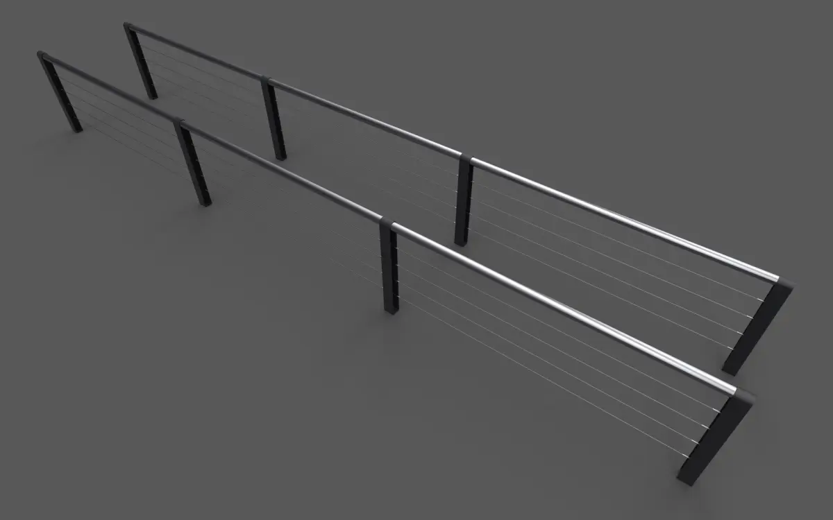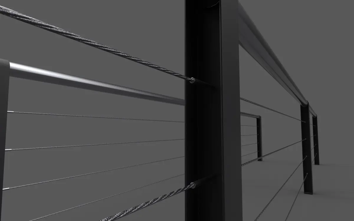 Compact city railing made of galvanized steel treated with powder coating, stainless steel and stainless steel cables. 2k PBR and UHDRP textures.
