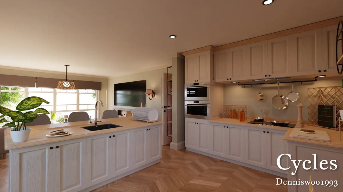 The entire house and kitchen is created using a modular setup:All the origins are placed in such a way that parts rotate and connect well .Doors have their origins at their hinges.The grid is 3.6x3.6x3 meters in Blender. If you want to use the grid while moving these parts: make sure to search for ‘’unit scale’’ on the left in Blender, and set it to 10. When you are done, set it back to 1.Every part has both their object and data named.