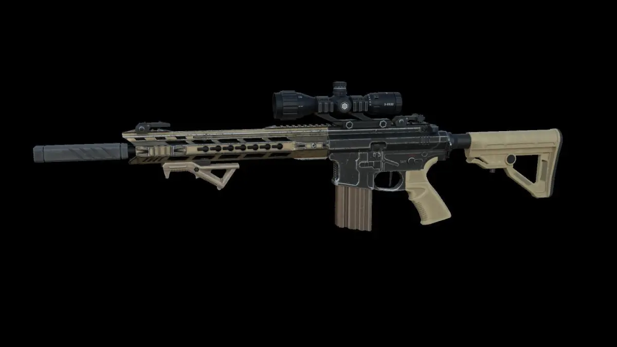 MCR Carbine: body; selector switch; charging handle; bolt; dust cover. (Black; Tan; Two Tone; Camo; UCP; Digitan) (Tris: 14,017; Verts: 7,290) (4K and 2K texture options)