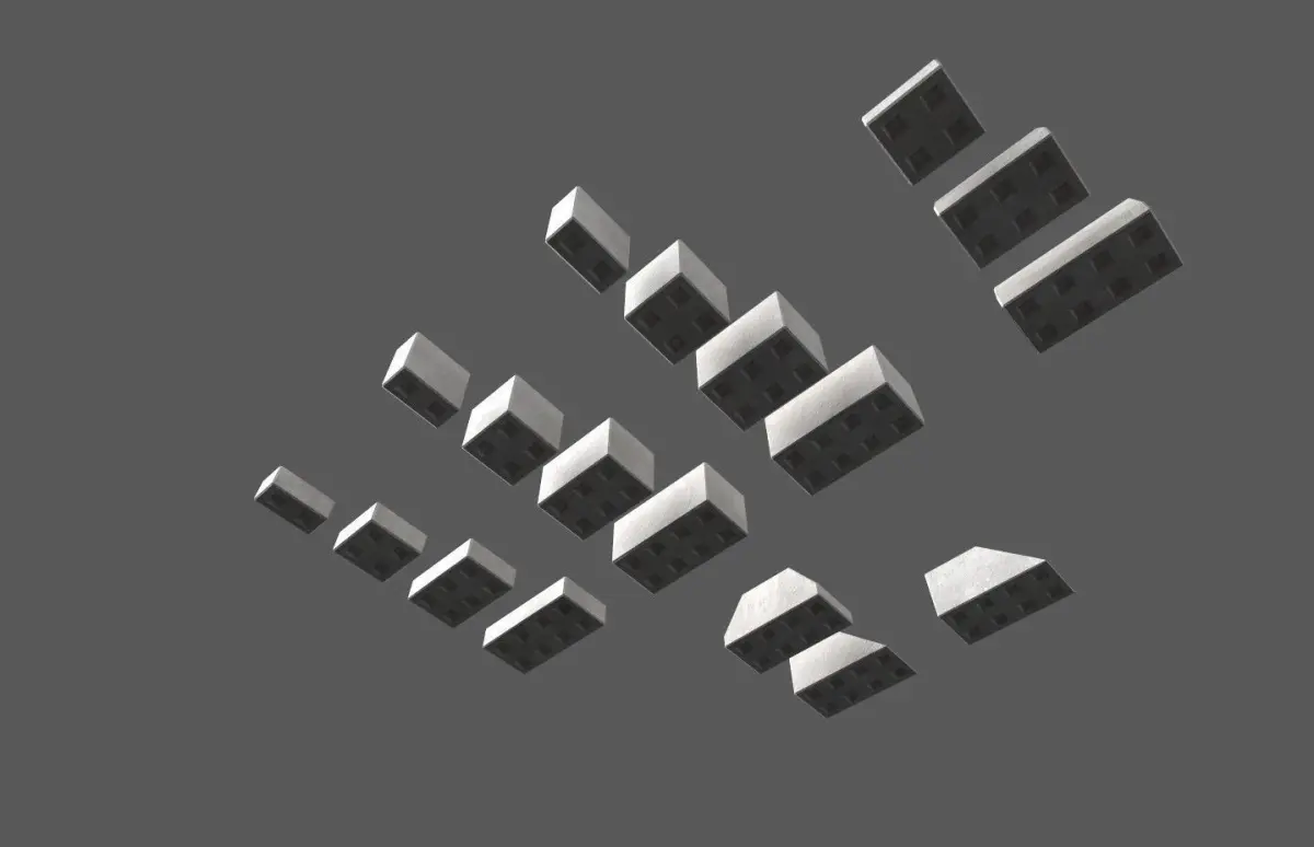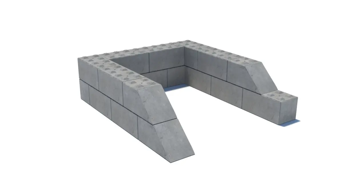 This is a low-poly set of modular concrete blocks, with which all kinds of constructions (walls, pits, barriers, foundations and so on) can be built. They are very common at agricultural and industrial sites for fast and cheap building. All blocks have dents on their bottom side corresponding to the knobs on the top sides. The knobs and dents are interlocking perfectly when stacked, preventing the blocks from slipping apart. Each block has at least one (or two, depending on its size) connectors on top for crane attachment.