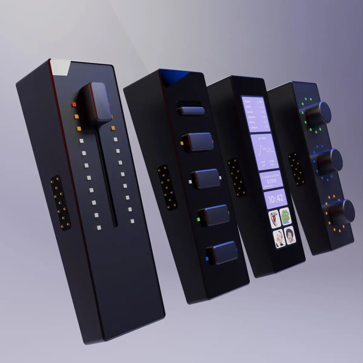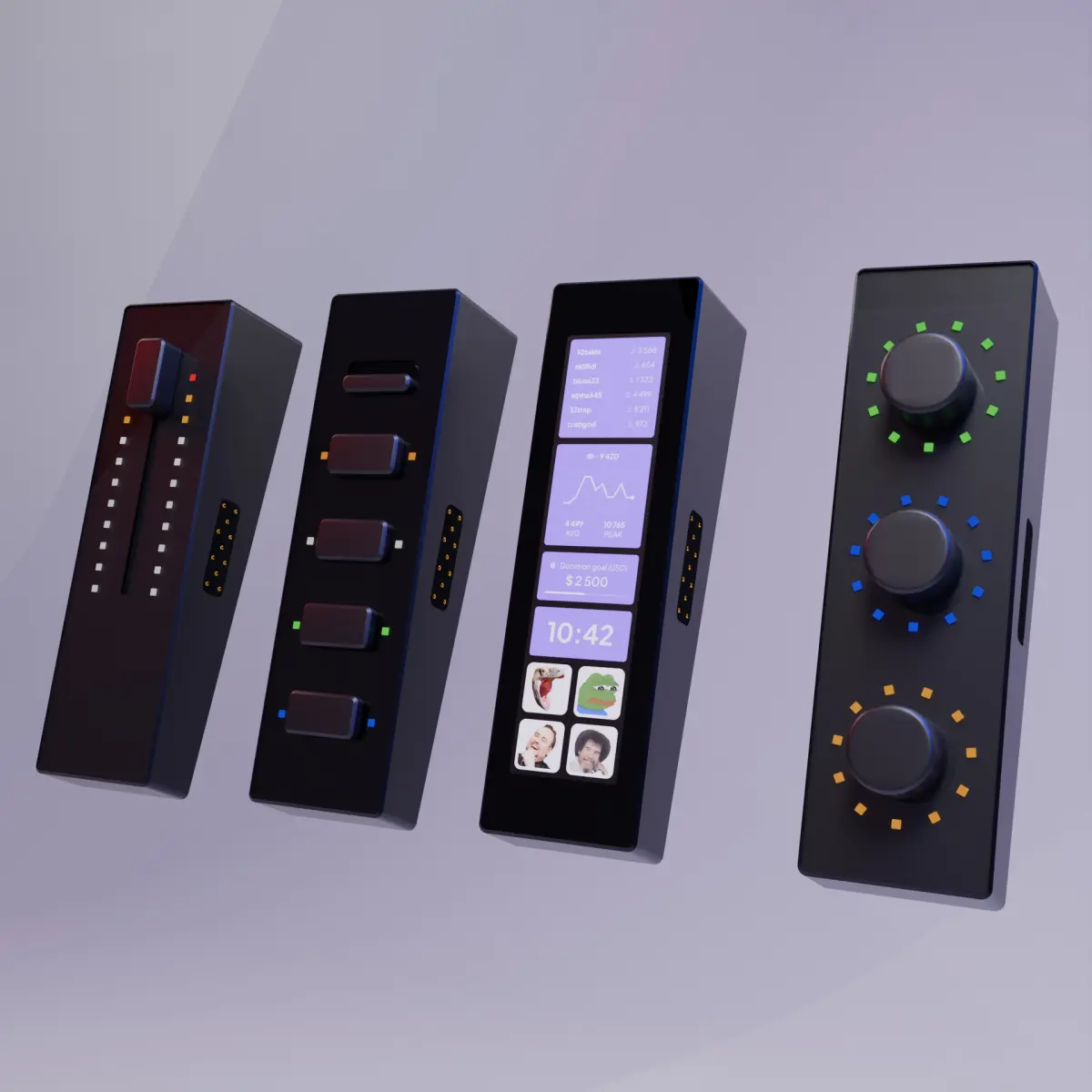 One Touch: A multi-functional command center with customizable widgets, ideal for managing time, notifications, and more.Slide: A precision linear potentiometer with touch control, providing smooth, accurate adjustments for volume, tabs, and creative tools.Click: Mechanical switches with LED indicators, perfect for quick commands, app launching, and macros.Spin: Rotary dials with RGB LEDs, offering tactile control for fine-tuning settings in creative software and smart-home devices.Key Features: