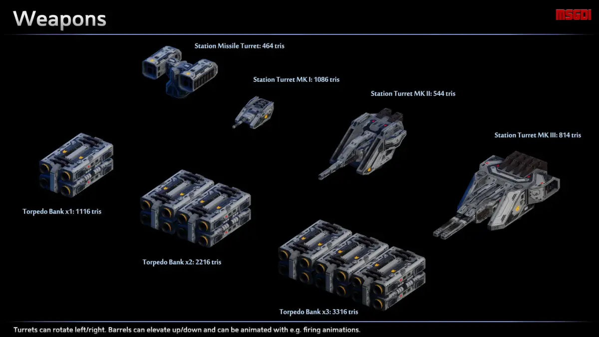 - Final tris count depends on how many modules and weapons are used for the station