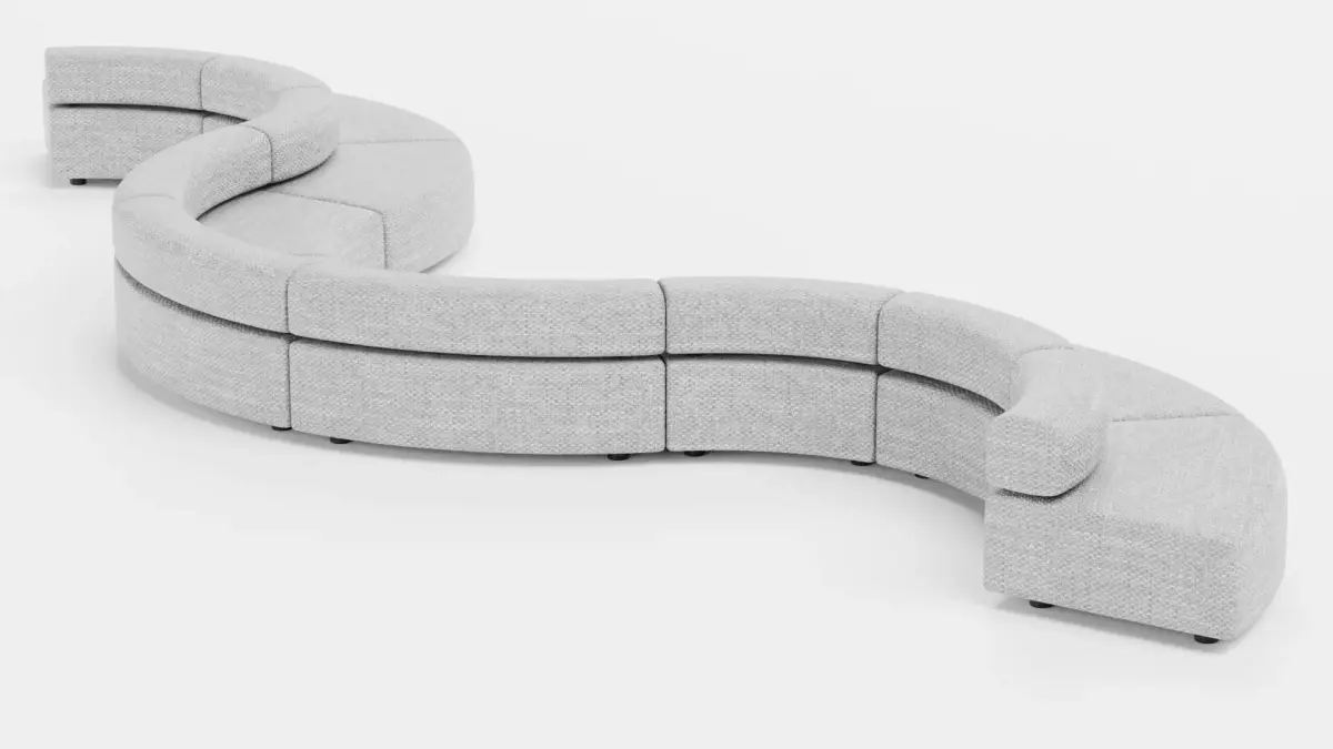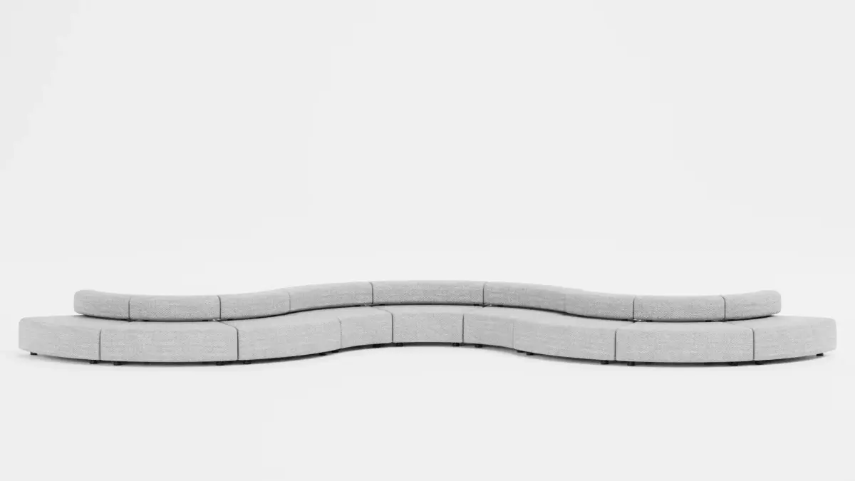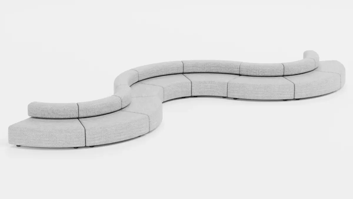 A modular 3D sofa arranged in an extended wave-shaped layout, designed for modern public and lounge interiors. The design features a low-back profile and fabric upholstery with a light grey textile texture and visible weave structure for added realism.