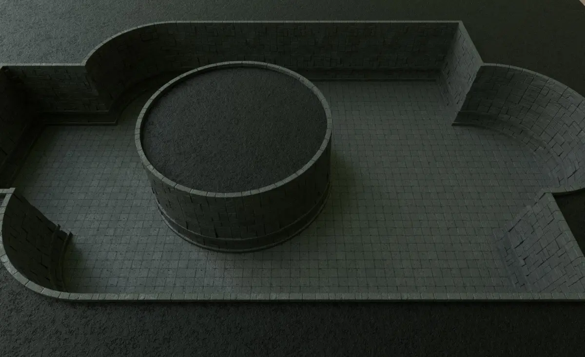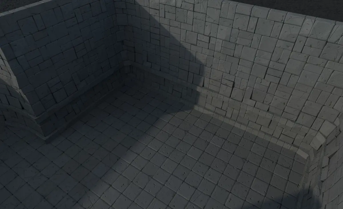 A set of modular dungeon walls. Includes standalone floor, wall, inner curved wall, outer curved wall, inner corner, outer corner, and a void block for empty spaces.
