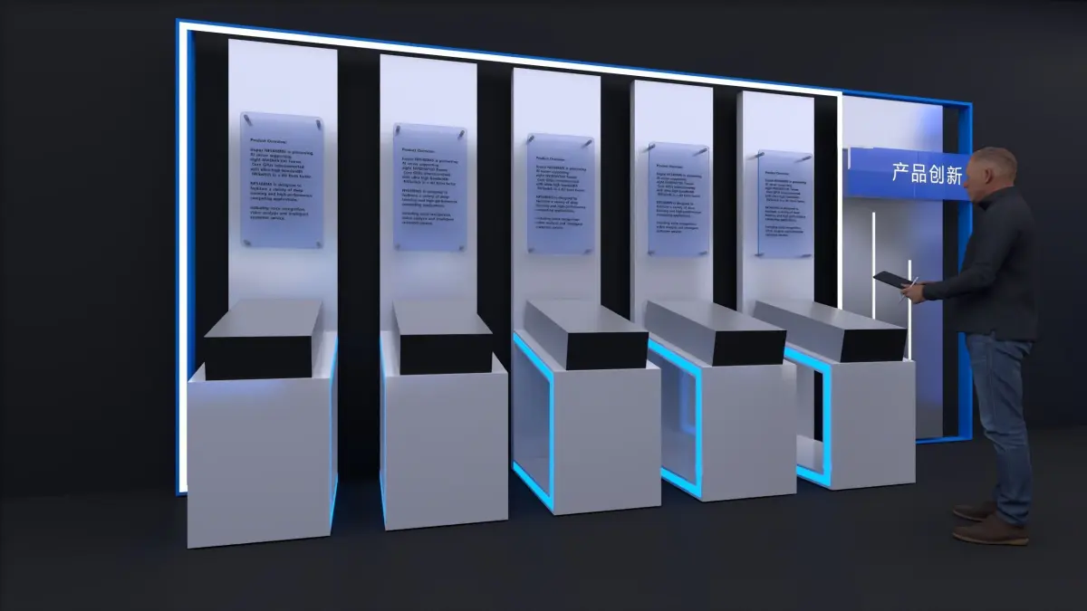 The model provides a 3ds Max project file package containing textures, V-Ray materials, and lighting setups. An FBX format file is also included.Science and technology display panels, lightweight exhibits, modular exhibits