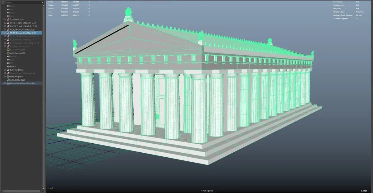 Premade Temple Have from 45k to 367k Poly witch you can change using: Lower level assets (columns, Frieze) and stretching parts from base to custom size, and playing with Materials UVs repetition)Materials are Arnold standard surface Shaders and Arnold mix surfaces with textures .FBX materials are Plain Lambert with custom color so you can connect your own materials faster without manually select every object .Asset is divided in 3 part for easier import:Building Blocks Basic (all parts for making custom Building modules)Temple_Blocks (premade Blocks for faster assembly of custom Assets)Temples (premade temple assets)
