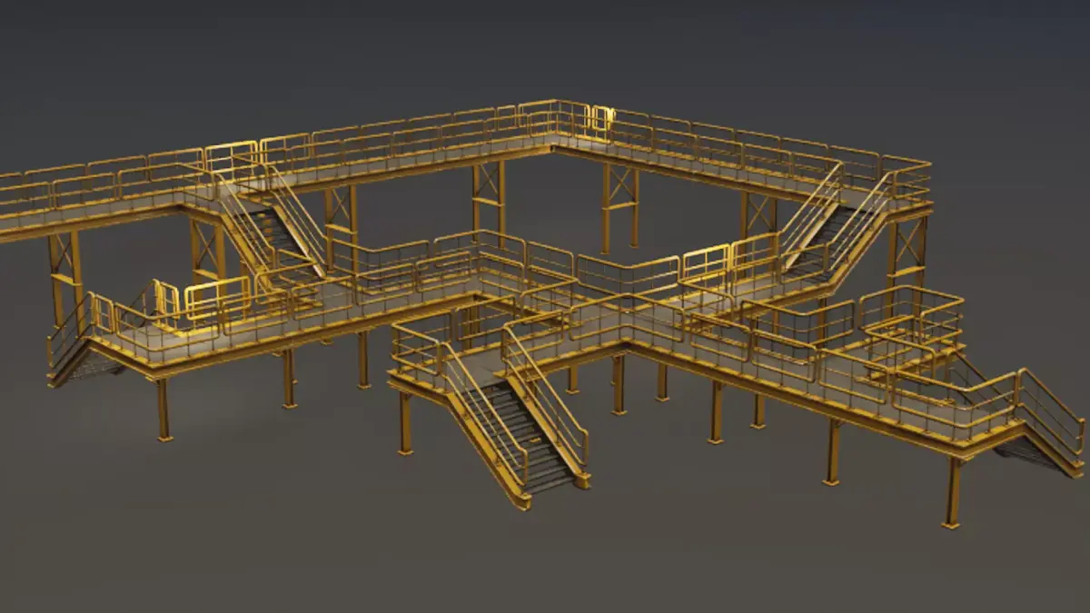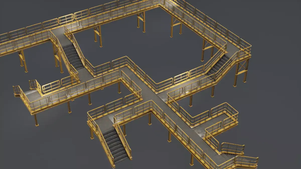 A modular set of industrial stairs, walkways, and platforms, designed for factories, power plants, refineries, and technical environments.Each element is built from metal beams and railings, allowing you to easily assemble complex multi-level structures — from small access platforms to large industrial catwalk networks.