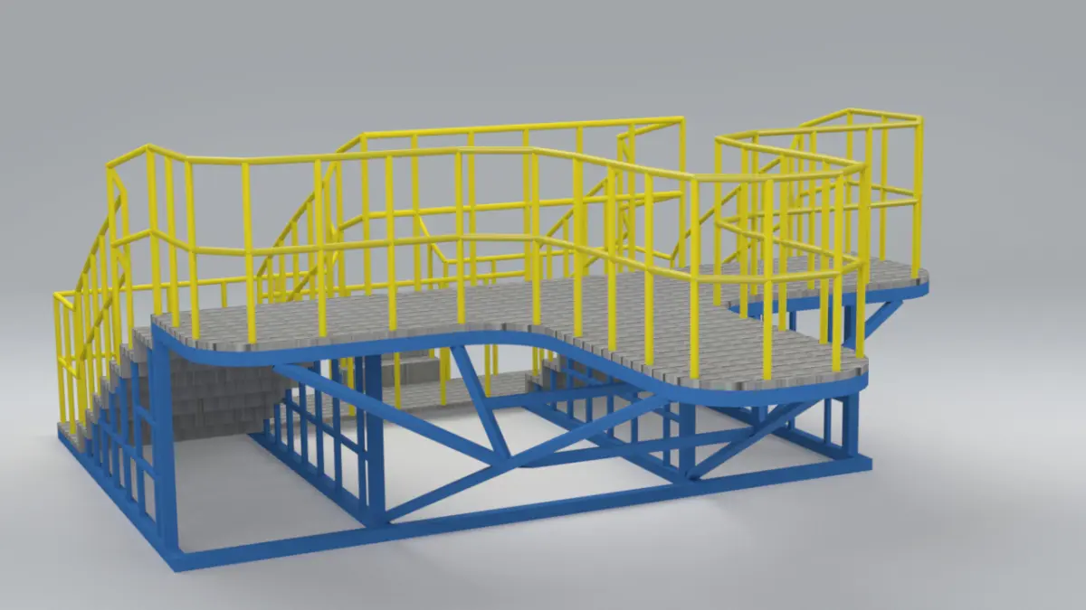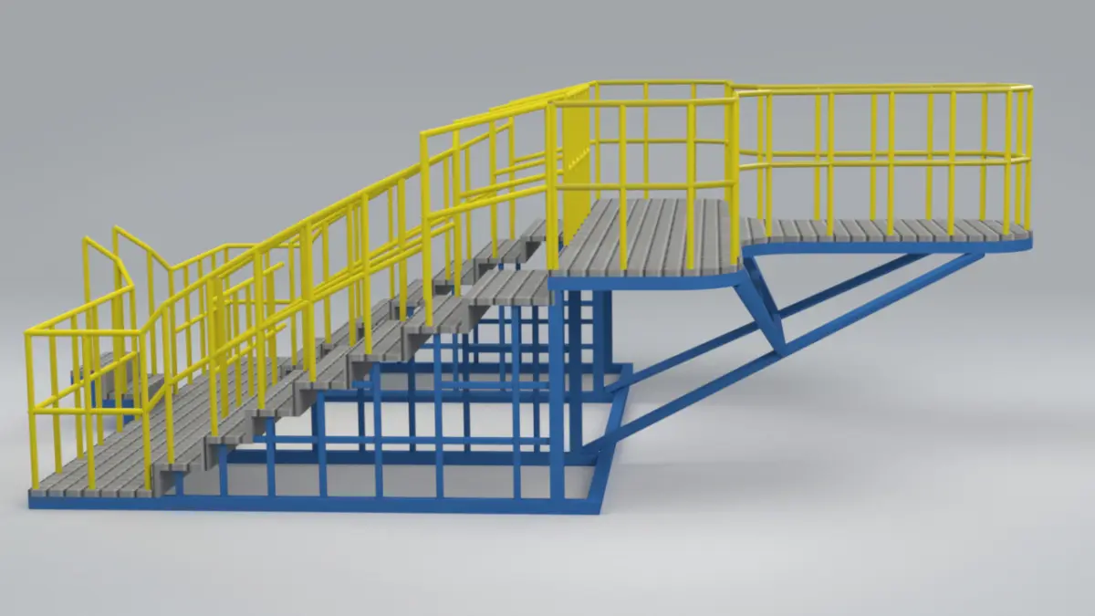 This is a high-quality, single-part 3D model of an industrial metal staircase, fully designed in SolidWorks 2023. The model includes integrated safety railings, dual access stairways, and a large upper deck platform, all built as a single solid body for simplicity and compatibility.