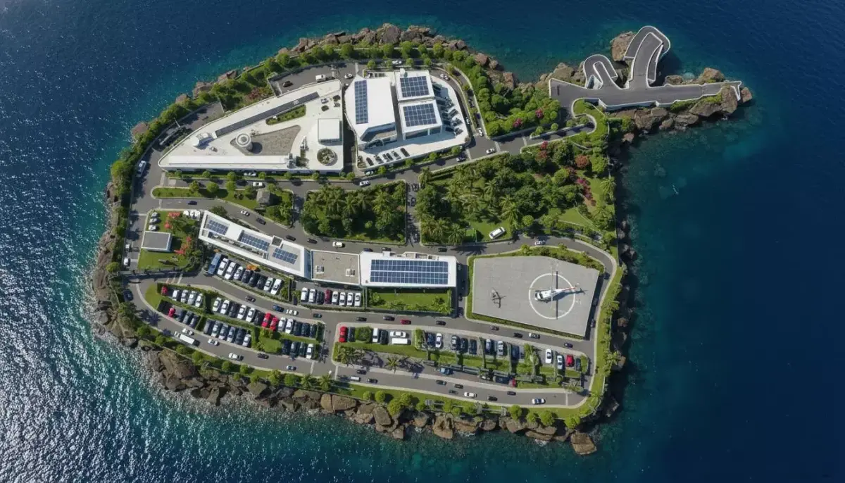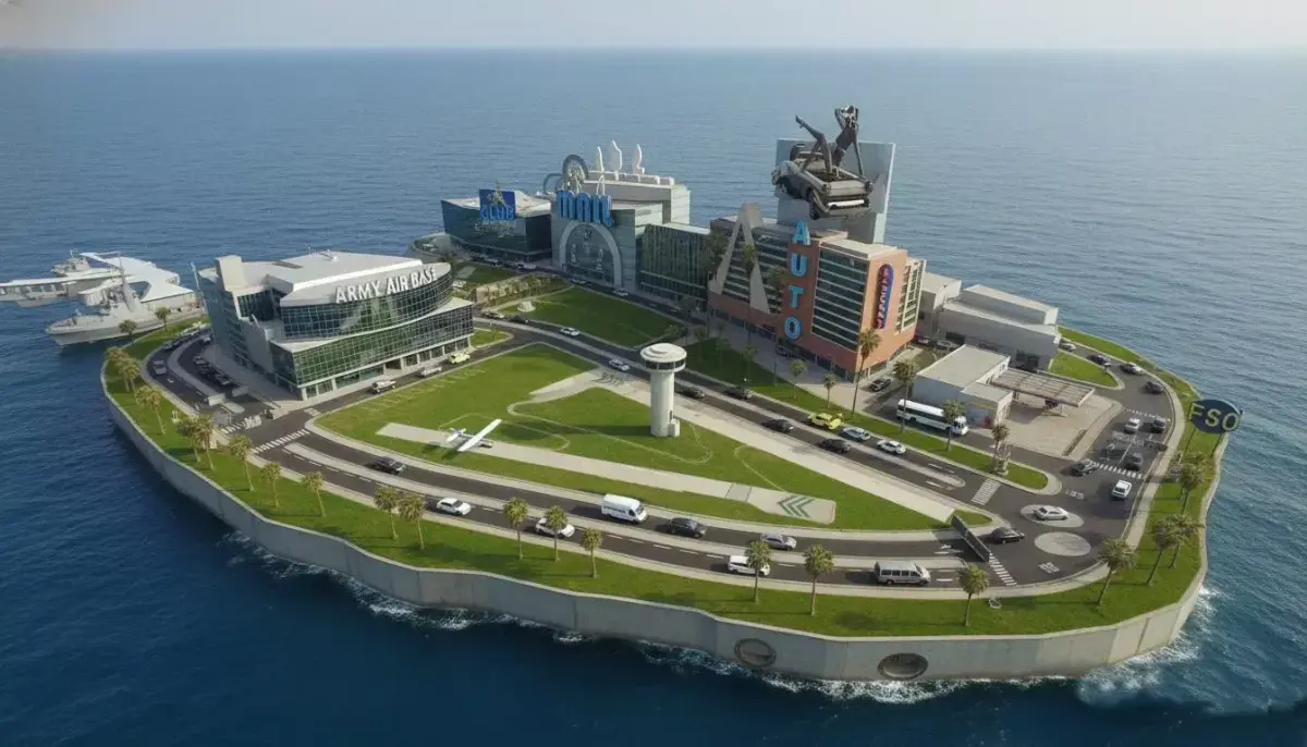 The island features a modern jet fighter air base with two runways and two hangars. Additional elements include watch towers, organized car parking areas, and a beautifully designed road tunnel on the left side of the map. Gas pipelines are placed along both sides of the roads and marked like bridge structures for an industrial look.