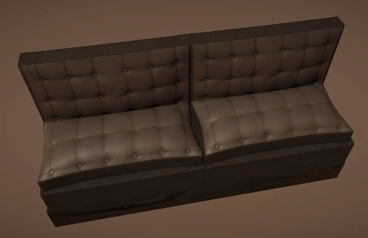 Casual modern booth couch seat with leather-studded cushions and back, suitable for use in a diner, restaurant, bar, cafe, etc.