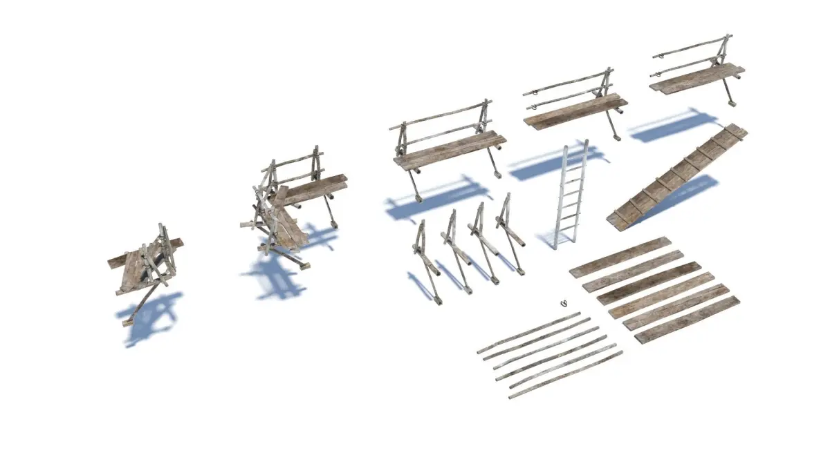 Low-poly historical accurate reconstruction of a medieval cross beam scaffold, commonly used to build stone castles, towers city walls and so on. The side arms were placed and walled in approx.. every 2 meters. Thick planks placed on them act as walkways. Every 1.5 – 2 m in height the next course was placed to guarantee a safe working platform. Most times this kind of scaffolding was built on both sides of the wall with arms reaching through the wall’s diameter and sticking out on each side.