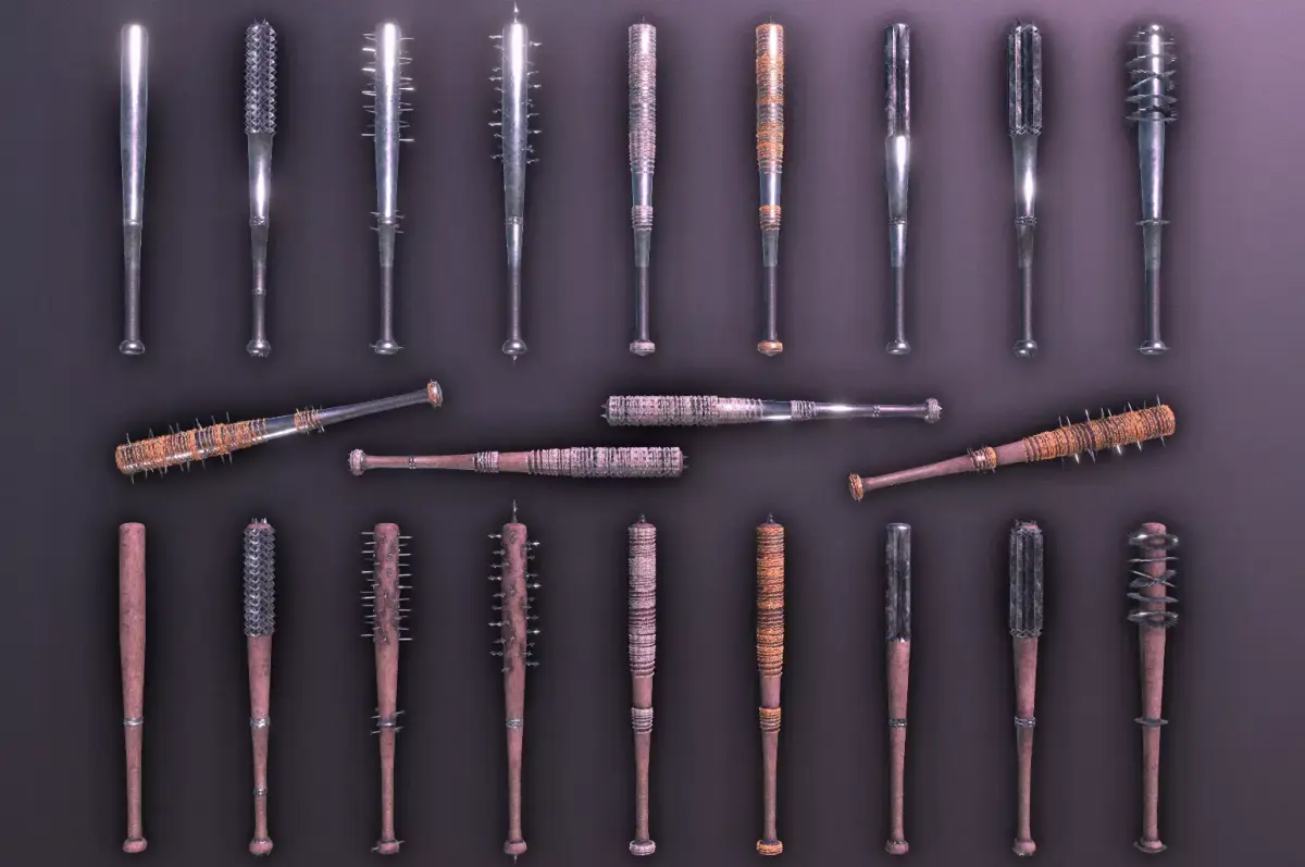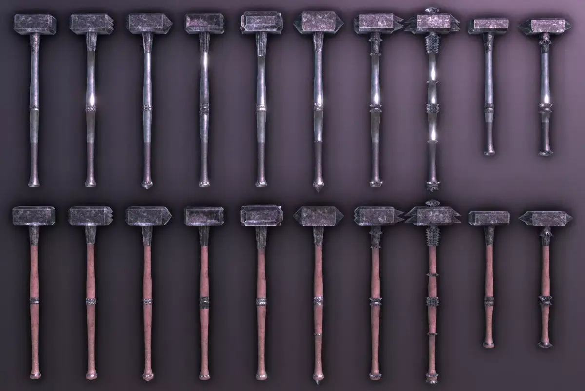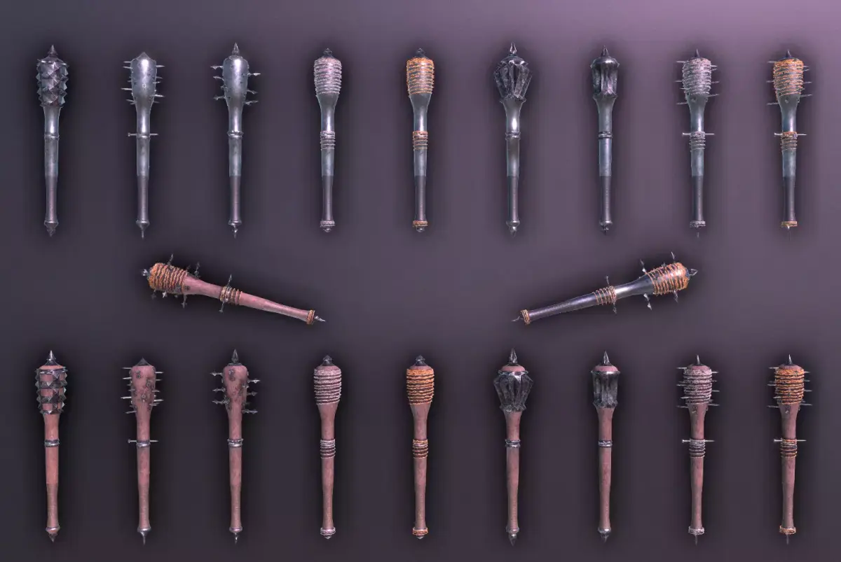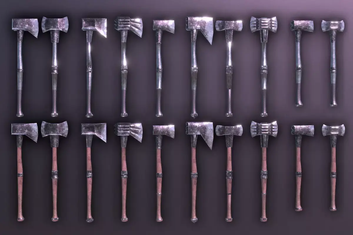 - Weapons sets include Maces, Bats, Hammers, Axes, Knives, Swords & Shields