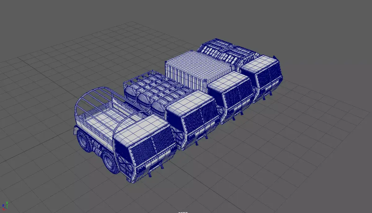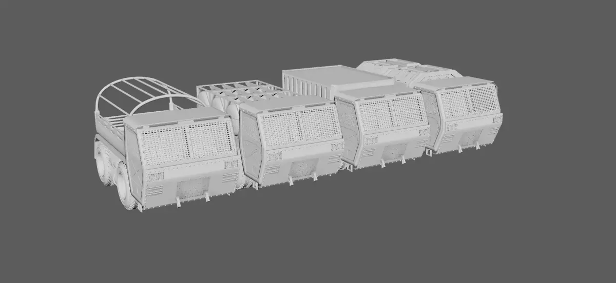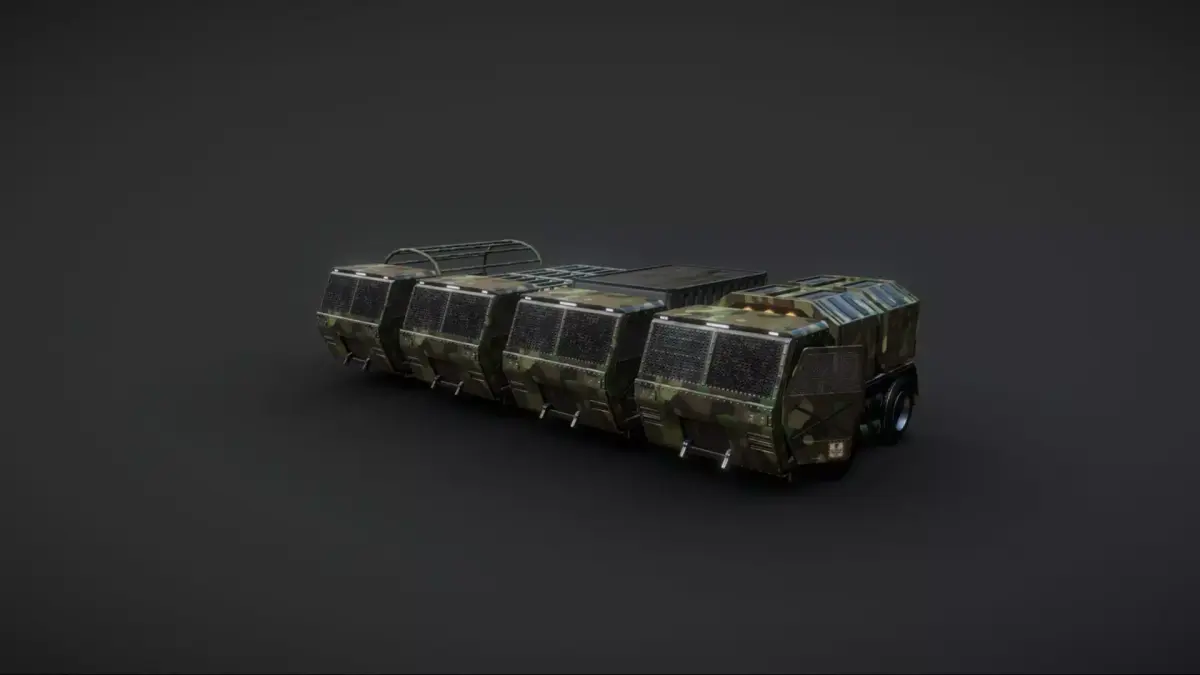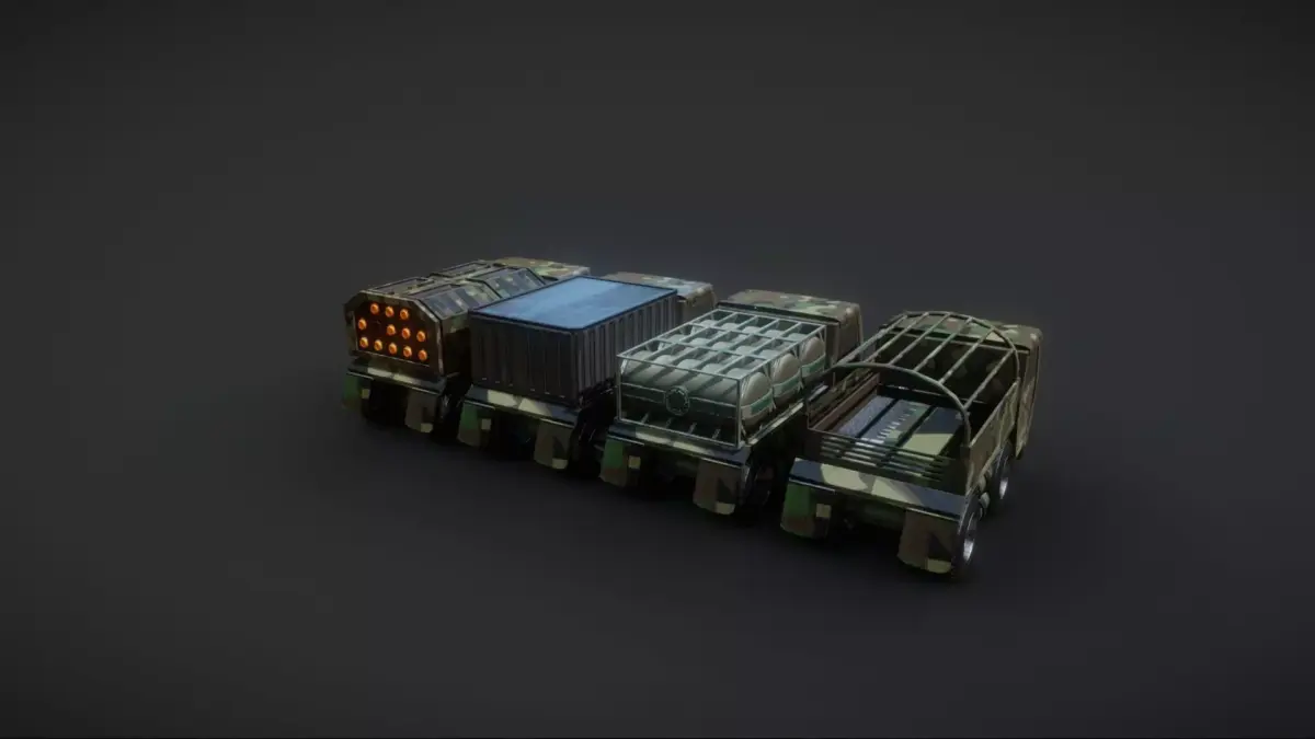 a modular military transport convoy featuring a heavy-duty camouflaged truck with multiple cargo and utility modules. Each section is designed for a different logistics purpose — including fuel barrels, storage containers, and open-frame cargo racks. Built with a rugged, realistic aesthetic, the convoy is ideal for use in military simulations, RTS games, or post-apocalyptic environments.