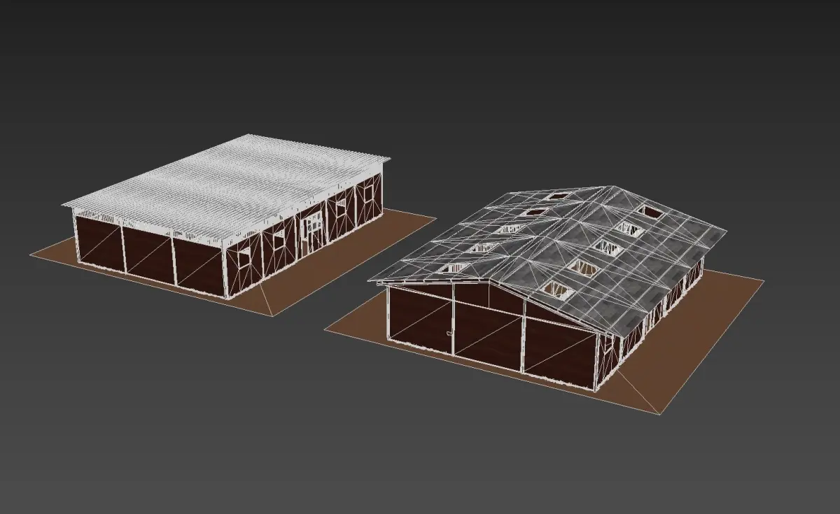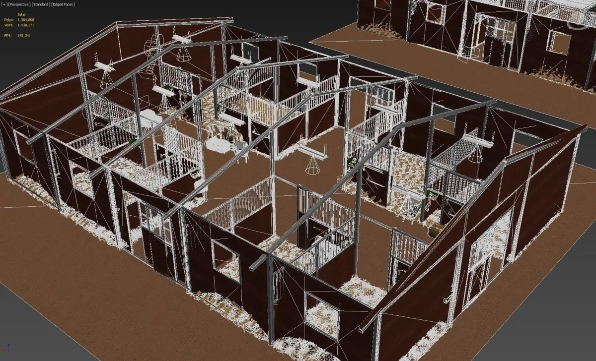 The scene itself if approx 1.3 million (about 660k per stable due to hay meshes). Without hay meshes, the stables are 140k polygons per stable. The stables come in .MAX and .FBX formats but the assets come in obj, dae, 3ds, max and fbx formats.