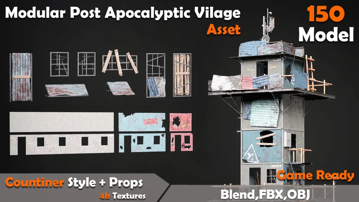 Modular Post Apocalyptic Village AssetDamaged Panels 20Trash Set 10Cables 6Scarf Holding 5Metal Structure 11Wood Plank 7Pipe Guard 5Container Structure 6Container Walls 37Metal Connection 4Assemble Props 21Building Props 11Ready Buildings 6Other Structure 10Blender 4.2 CyclesFbx And Obj4k TexturesModular ModelsPBRLow poly And Mid Poly