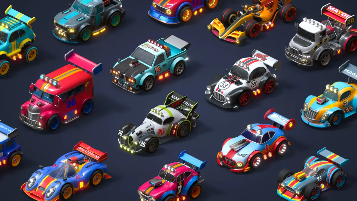 15 unique cars - from race cars to trucks - all in a unified style. Each has 11 modular parts that can be swapped, hidden, or shown to build a flexible and intuitive upgrade system.
