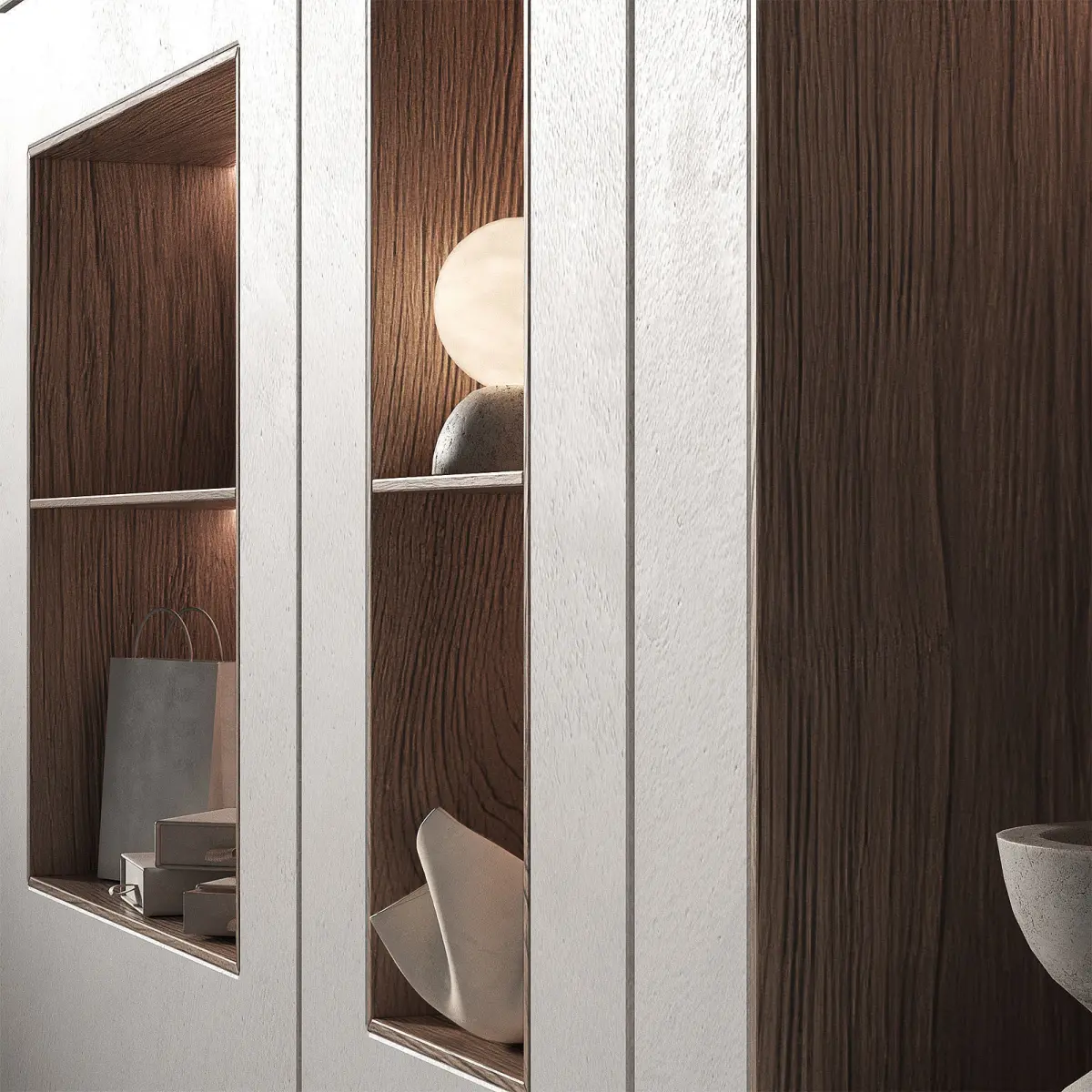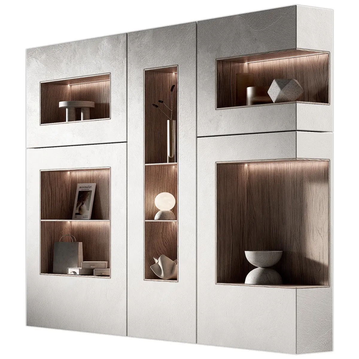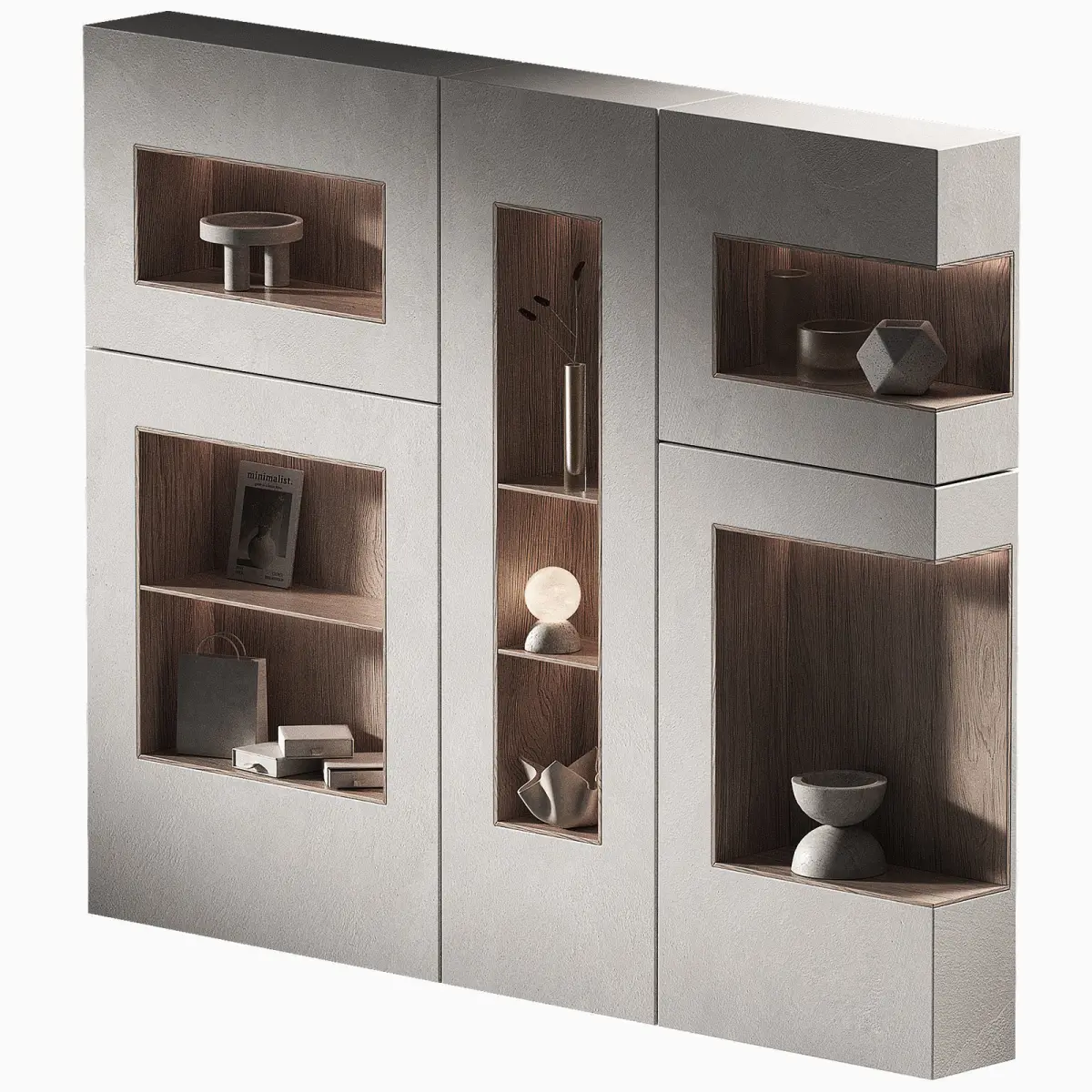 The 3D model contains shelving with a niche in the wall. rack - showcase. Can be used as a rack, for a partition in the house, a showcase for products, a rack for a store. Square and rectangular built-in elongated niches with a wooden internal frame with decor.The composition contains decor: boxes for decorations, a round lamp, ceramic bowls, vases, a twig.The model is easy to edit. The model is completely modular. Easy to change to the desired size.The color of wood and plaster can be easily adjusted using a color map.Suitable for styles: modern, minimalism, modern, scandinavian, eco, japandi, nordic and others.