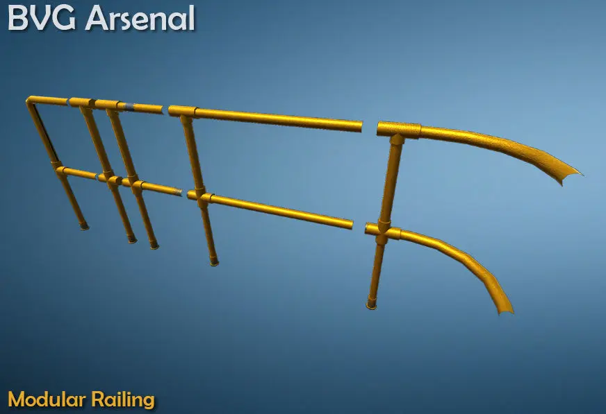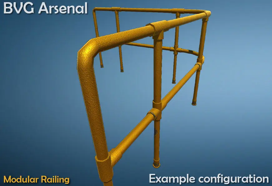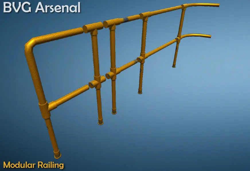 This package contains game ready railing system. High quality textures for close up renders. It is a set of 5 different railing pieces that can be arranged to create many different kinds of railings.