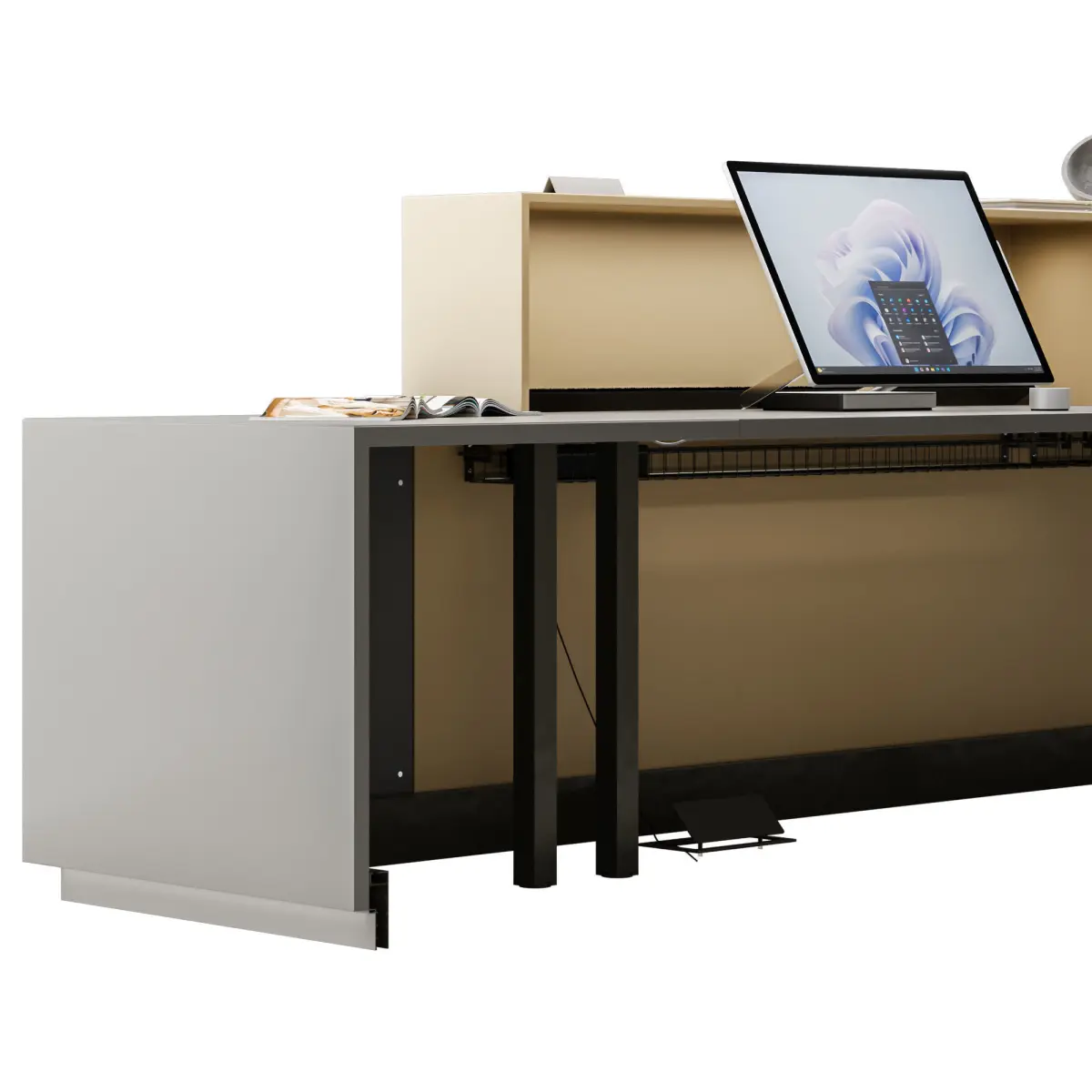 The spacious worktop and functional accessories make the Z1 an example of order and practicality. Cable trays and cable access doors hide cables, maintaining the aesthetic appeal of the reception area.Lighting is the central feature of Z1: the rational geometry of the lines is highlighted by LED strips that define the intersecting modules and enhance the dialogue between the main bodies and the base. LED lamps complete the composition, illuminating the interior, creating an inviting atmosphere. Thanks to the modularityproduct, the composition of the Z1 elements adapts to different spatial and functional requirements. The structure is available in lacquered finish with color options from bright to neutral and pastel tones that are soft and enveloping, so that it adapts to different types of interiors.