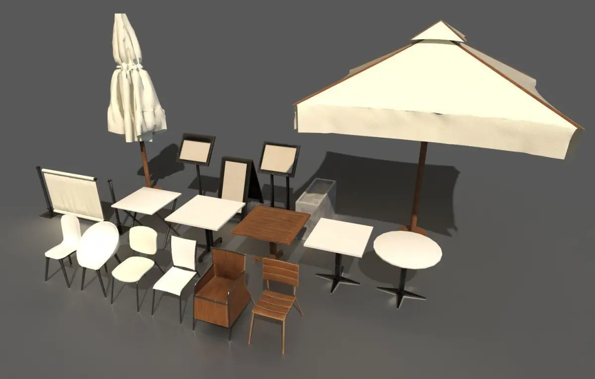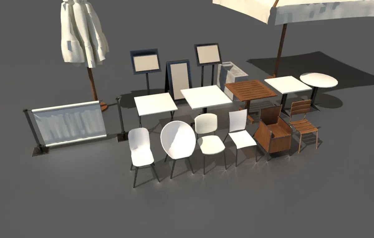 6 x chairs5 x Tables3 x Menu stands2 x dividers 2 x Umberellas (1 x folded & 1 x Open)