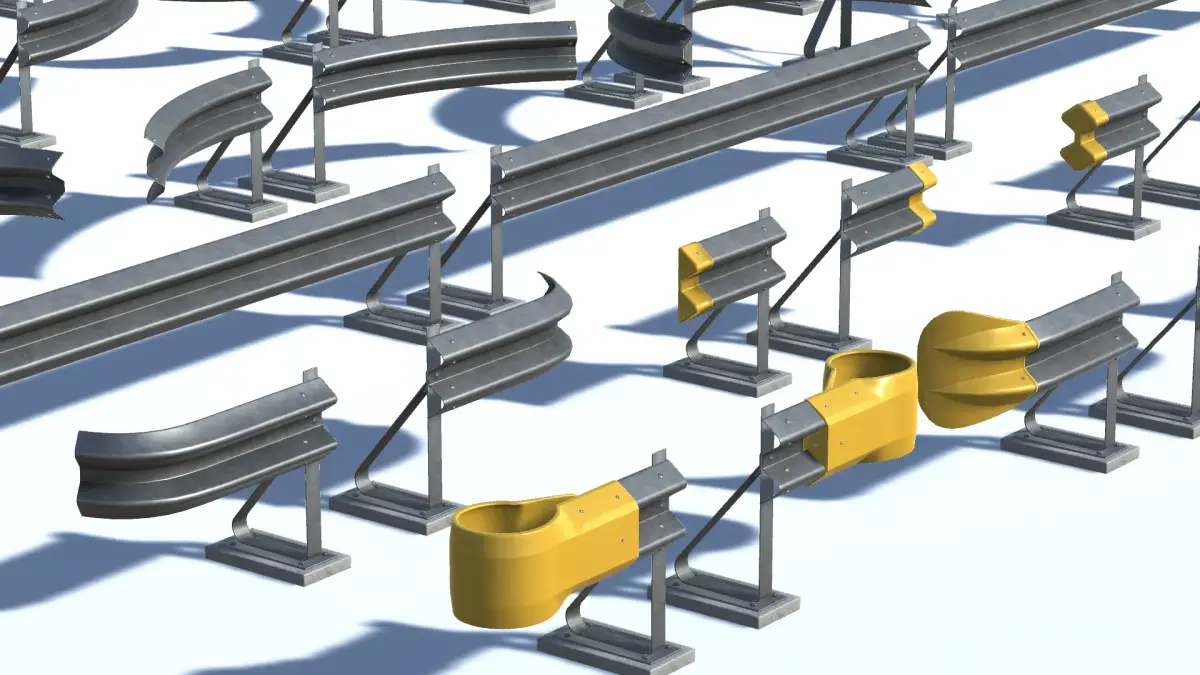 The kit is designed to be ready-to-go and flexible. Each section of barrier includes at least one post (either left or right), with longer beam sections also including two post versions. Each element is a seperate model so its position can be easily adjusted to fit your scene. All posts are placed on a concrete footing which has the depth to allow placement on un-even or sloping terrain - e.g. if there is a ditch behind the barrier. The footing is a seperate element so it can be removed easily if it isn't needed.