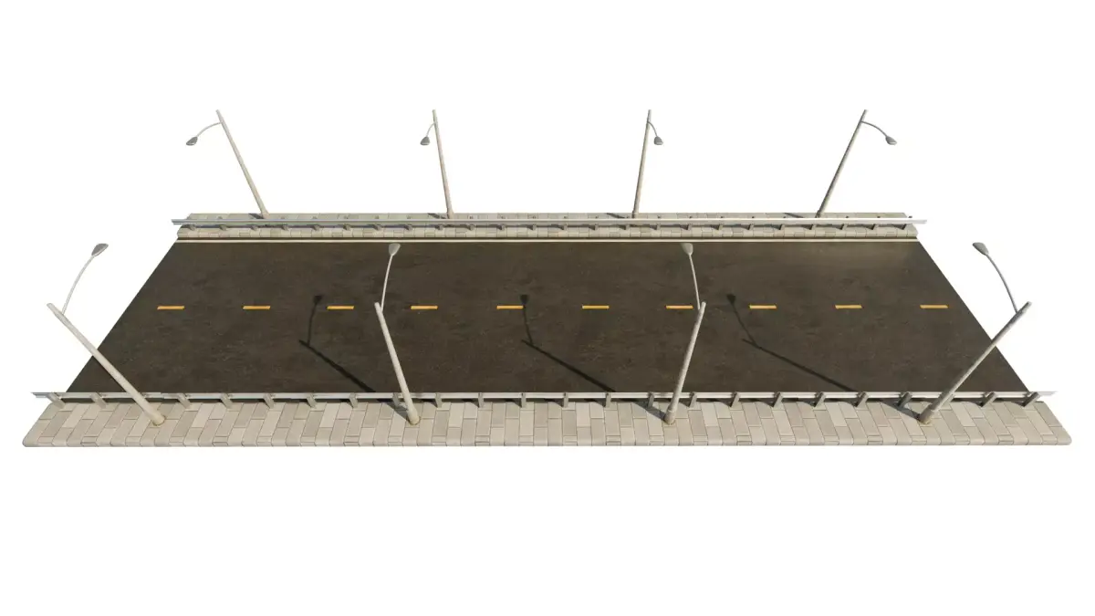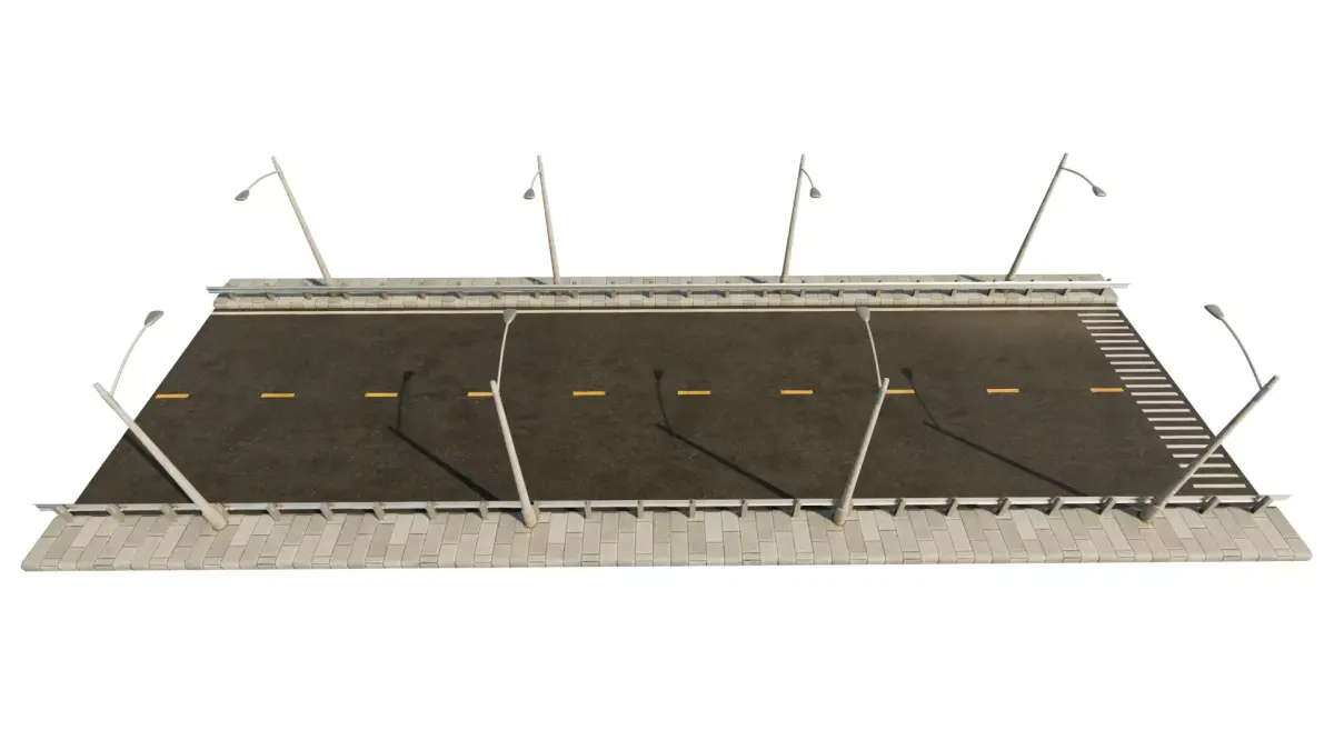 A game-ready modular road pack featuring straight segments, intersections, sidewalks, guard rails, streetlights, traffic lights, and utility poles. Designed for flexible city building, optimized performance, and easy snapping, it enables rapid creation of realistic urban road networks, crafted with precision.