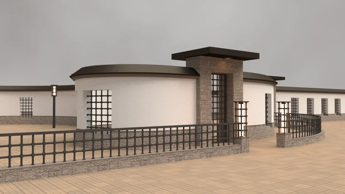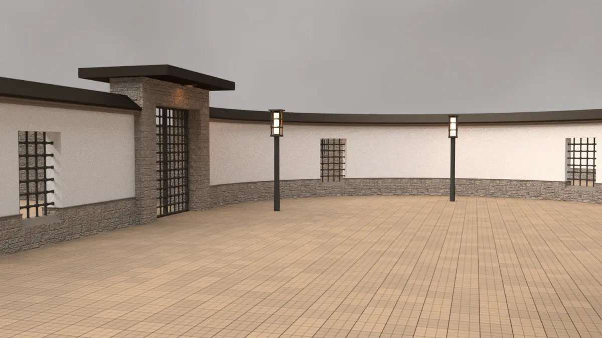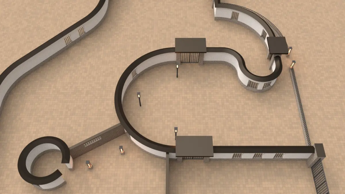 Two different radius of circles are provided, with plain walls and barred windows walls. And a extra bigger radius circle of lower fences. Straight walls in two different models with and without barred windows. Three sizes doors and gates. Different pillars. Post lamps.