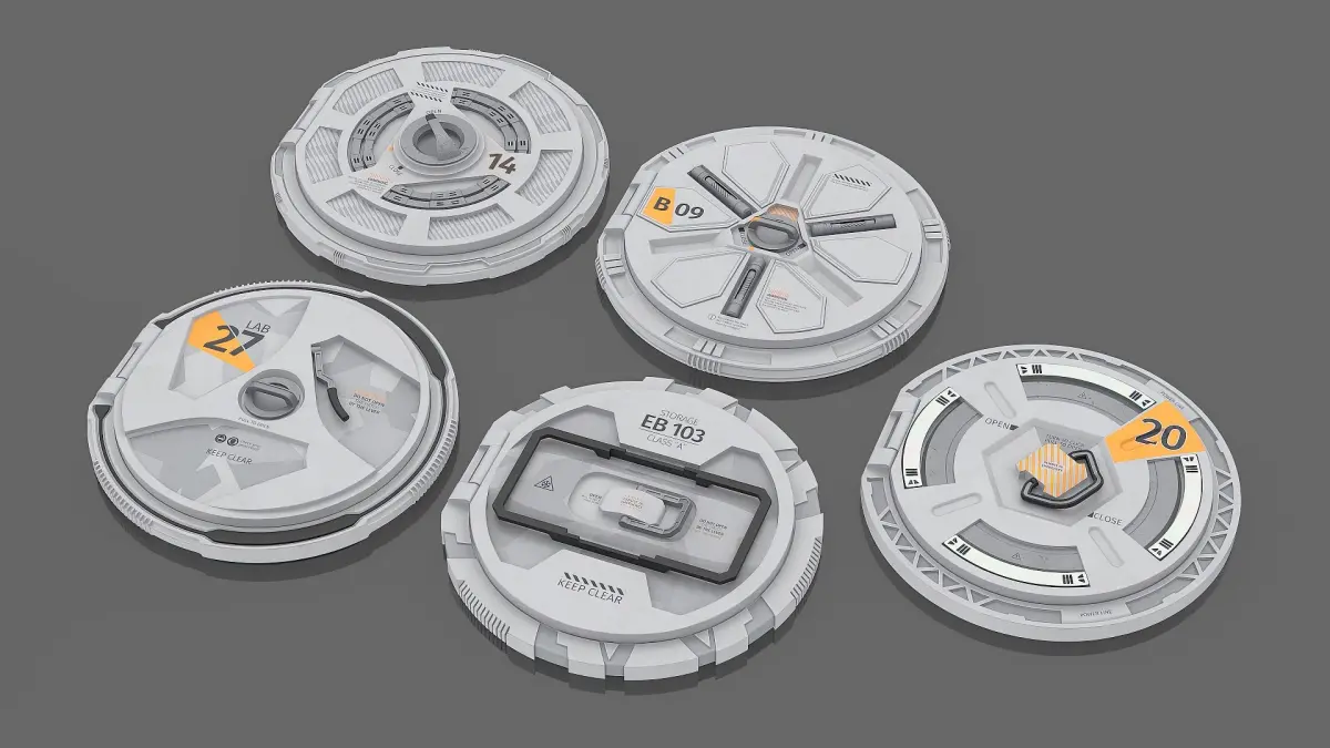 The model set features five distinct hatch designs, each with unique caution labels, identification numbers, and mechanical detailing. Their sleek gray finish, clean geometry, and functional layout combine modern aesthetics with high utility, making them adaptable for various sci-fi and technical settings.