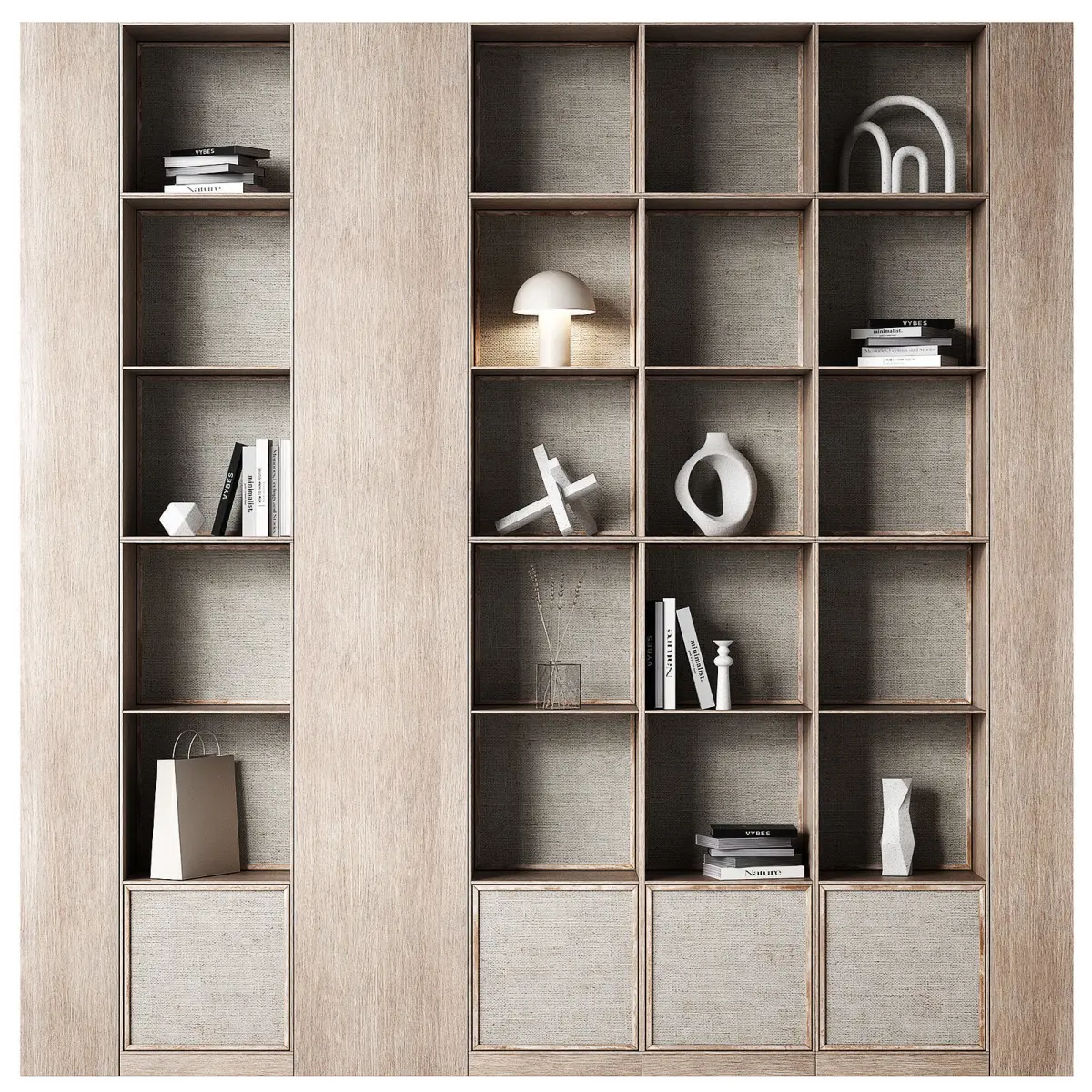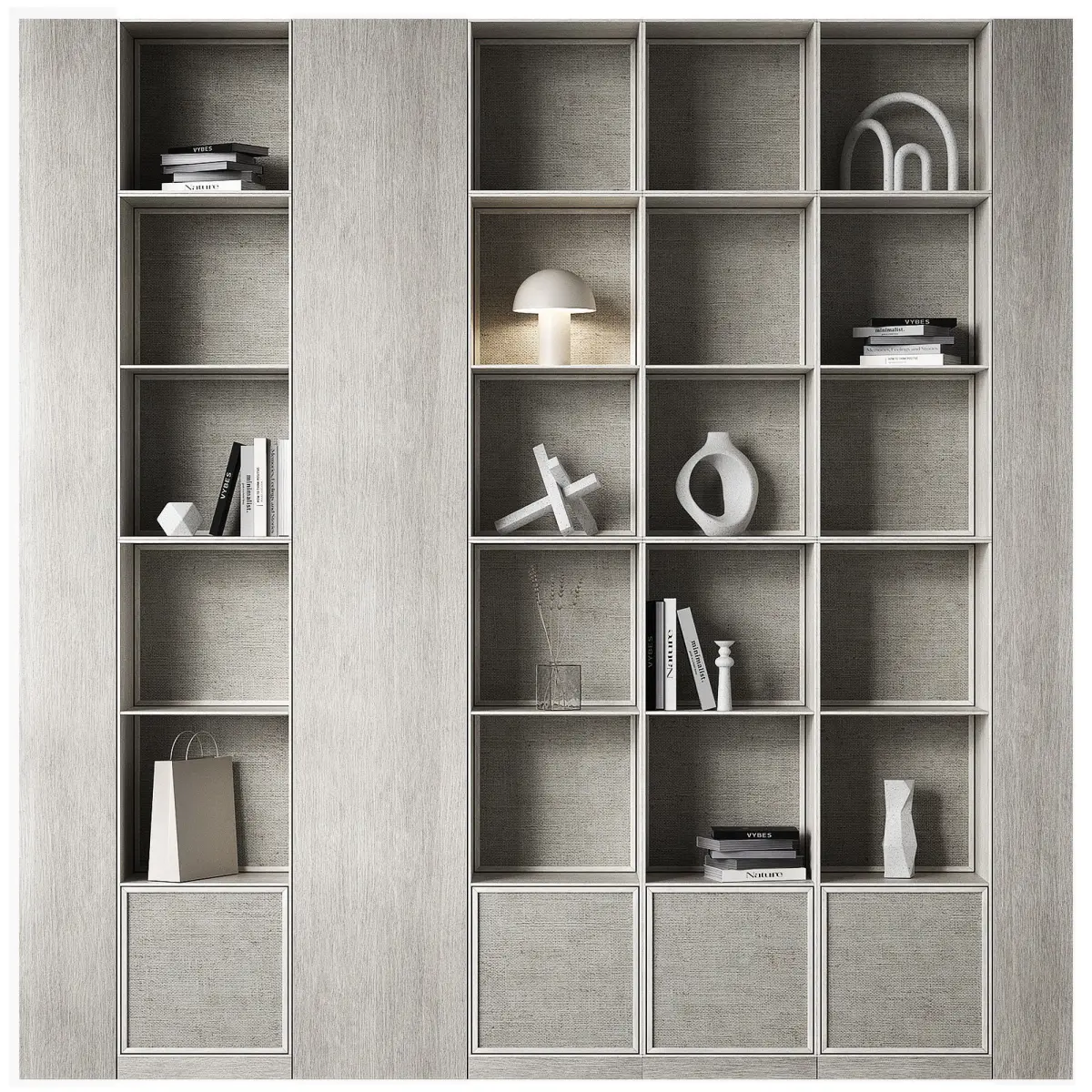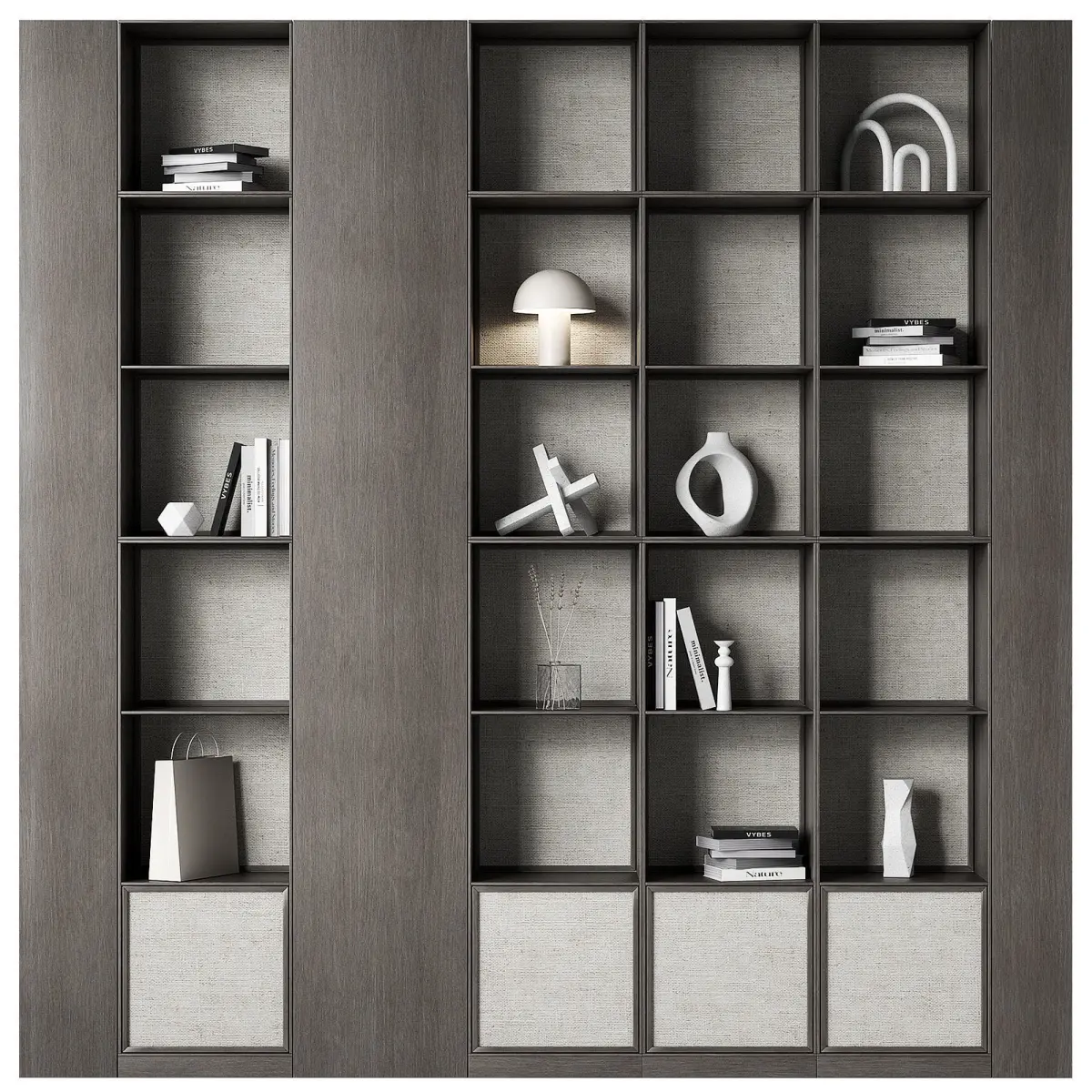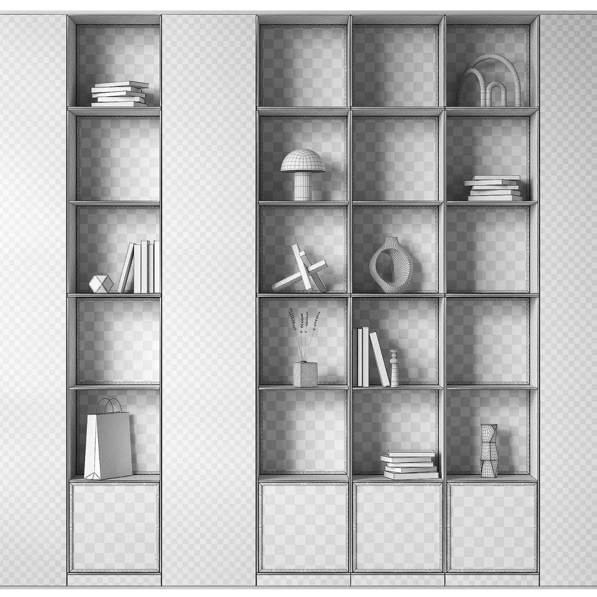 The 3D model contains designer shelving with decorative wicker inserts.3 wood color options. All 3 options are present and ready to render, no need to change the material.The composition contains decor: ceramic vases, lamps, books, sculptures.The width of each rack is 40cm.Height from floor 250cm.The model is completely modular, easy to edit to the desired size.