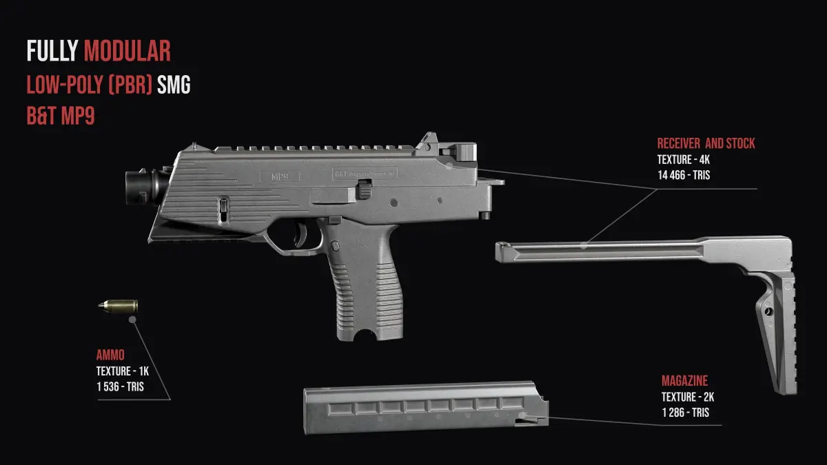 High quality low-poly model MP9 , created as close as possible to the original with exact dimensions, with highly detailed PBR textures(including textures for Unity and UE5 game engines). I create my models as realistic as possible. You won't see the magazine shaft , barrel, chamber or bolt , covered by the texture or geometry. If you even need to see the rifling in the barrel or any other small details of the weapon. Then this model is exactly for your project. Maximum manifold geometry in model. Open (non-manifold) geometry is only present in rare cases,but you will never see it even with any weapon animation and other manipulations.Game ready model for PBR game engines, renderers, first Person Shooters, VR games, and your other projects.