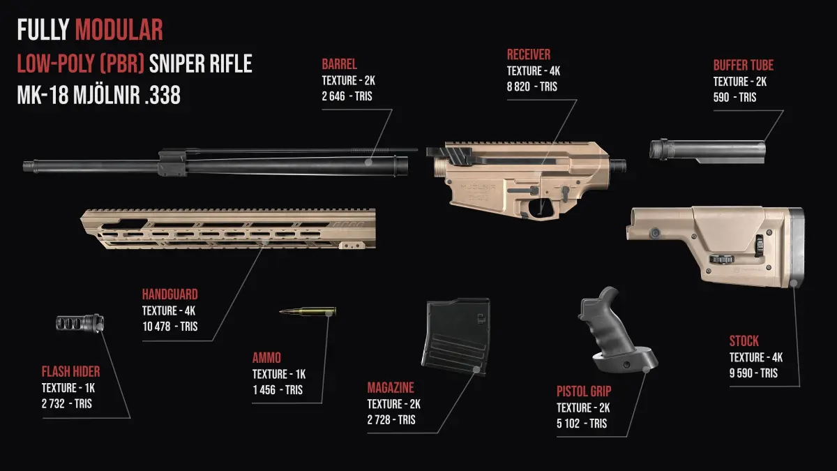 High quality low-poly model tactical mk-18 Mjolnir , created as close as possible to the original with exact dimensions, with highly detailed PBR textures(including textures for Unity and UE5 game engines).I create my models as realistic as possible. You won't see the magazine shaft , barrel, chamber or bolt , covered by the texture or geometry. If you even need to see the rifling in the barrel or any other small details of the weapon. Then this model is exactly for your project. Maximum manifold geometry in model. Open (non-manifold) geometry is only present in rare cases,but you will never see it even with any weapon animation and other manipulations . Game ready model for PBR game engines, renderers, first Person Shooters, VR games, and your other projects.