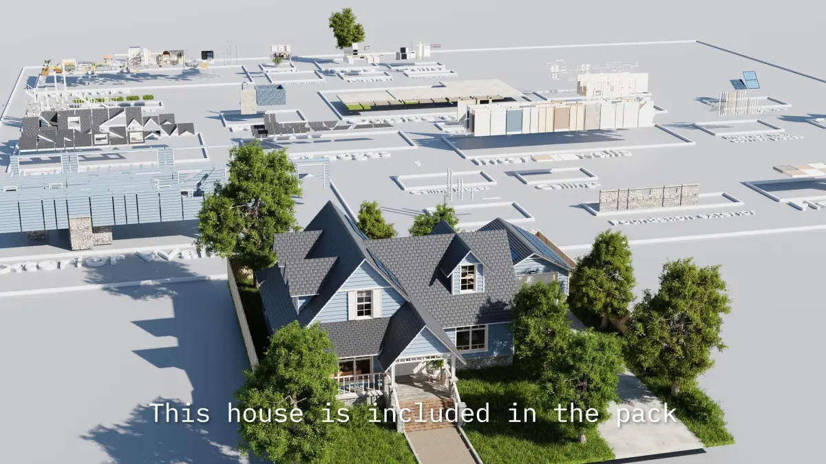 The house included is my ‘’Modular Classic Style American House 12’’ In this file the house has no Eevee lighting, but is set up for Cycles renders. This house is completely furnished and works with night renders too.