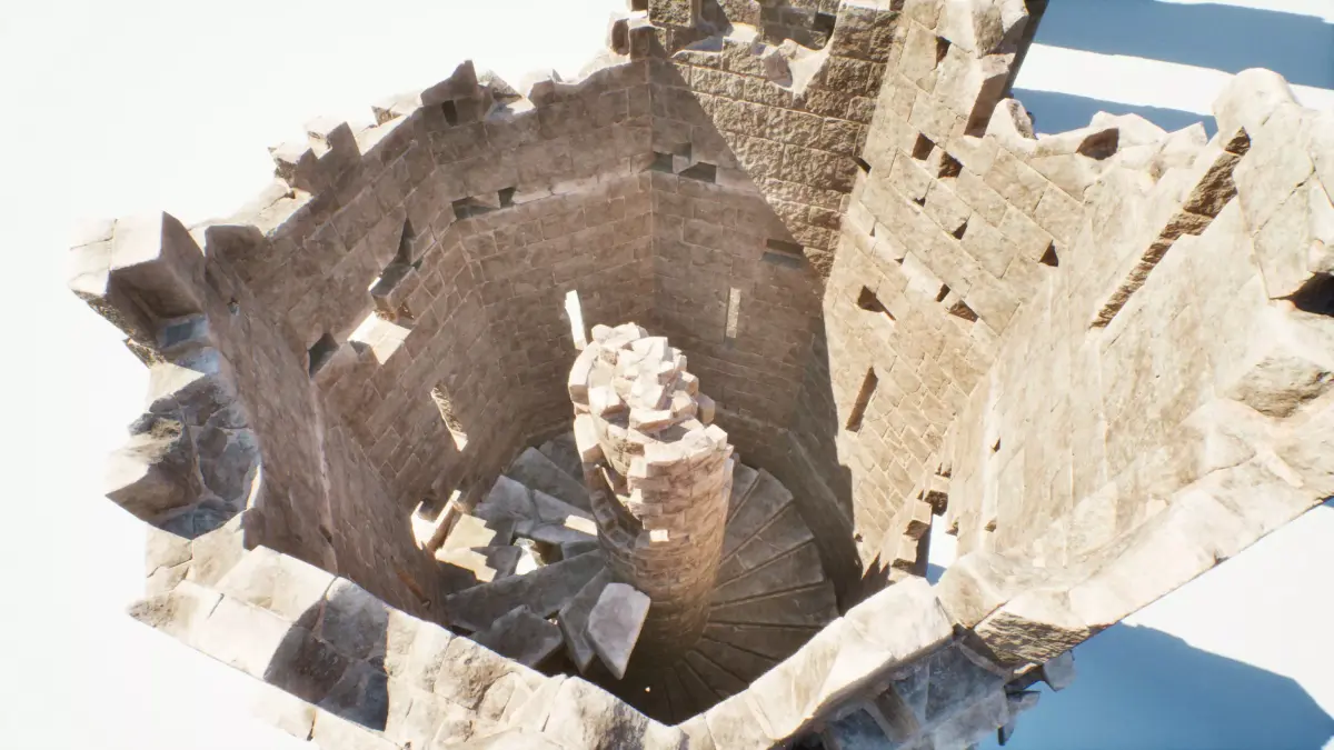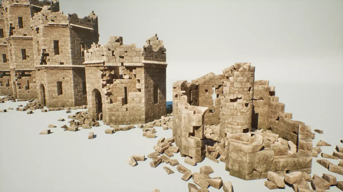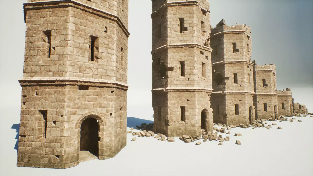 - Polygon tris count DoorModule-557k tris, DoorModuleDamage-475k tris, DoorModuleDestr-260k tris, WindowsModule-412k Tris, WindowsModuleDamaged-453k tris, WindowsModuleDestr-210k tris, TowerTop-678k tris, TowerTopDestr-419k tris, Stair – 127k, StairDamaged-103k tris, StairColumn-83k, Floor – 71k tris, BrickPile – 146k, BrickPileStair – 149k.
