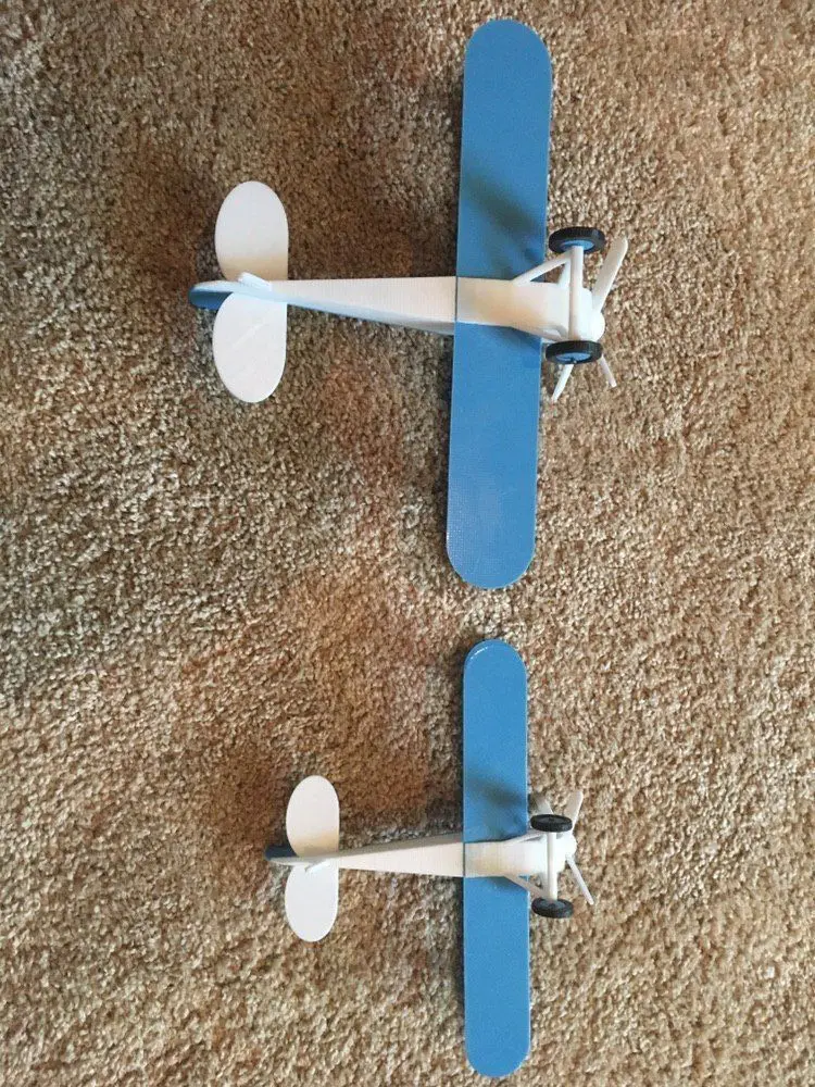 This is a toy that I've been designing and fine tuning for about a month, and I've finally decided to put this beauty up for sale for anyone to print. The wheels and propeller spin freely - you can hold the propeller up to a fan, vent, or strong breeze and it will whirl; I would not recommend throwing this model, but it is a sturdy design, regardless - I got it to lift off at about 30 mph out of the car window and the wings stood firm. When completed, The plane measures at about 8long with a wingspan of close to 10. You can also choose to print this design at 75% scale for a much cuter model (I actually prefer this size).