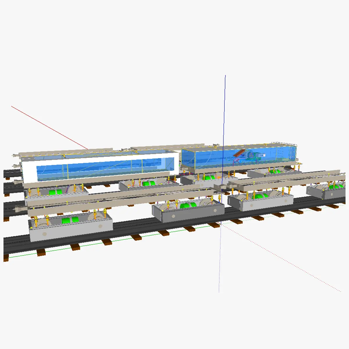 3D model of the modular train (internal combustion motor version). The modular train is a vehicle that is composed of a locomotive and railroad cars, themselves made up of modules that are suitable for driving on rails of any gauge, and for both trams or trains (the latter being generally heavier, note the different profile of the last rail -which is standard for trams-). When the vehicle arrives to the train station on the last section of rail (so before a different rail begins), people or cargo needs to be manually moved to a new modular train that is composed of different bogies and a different top section. Although in most cases 2 complete modular trains need to be present (one on each different type of rail), the components of both modular trains are the same which should make the trains much less costly to obtain. In some cases (e.g. in the case of changing from a wider to a smaller rail), it is however possible to simply move the entire top section of the railroad car unto the bogey of a wider rail (e.g. using a crane which attaches to the top rings of the railroad car's frame). Note thate although this approach is less economical than using some type of trains (which can run on 2 different rails of roughly the same gauge) on specific trajectories, it is much more versatile as by changing the entire bogey, rails of any gauge and type (train, tram, rack-and-pinion rail, ...) can be used. Also, besides the components (which are identical for all versions of the modular train and can be thus mass-produced cheaply), the vehicle is also made very light and simple in design.
