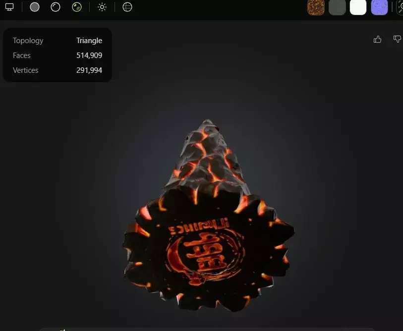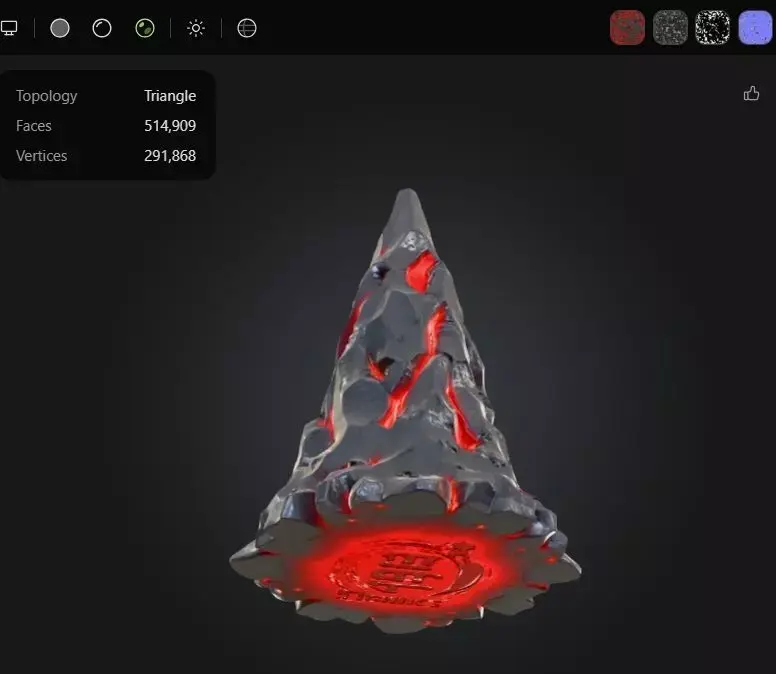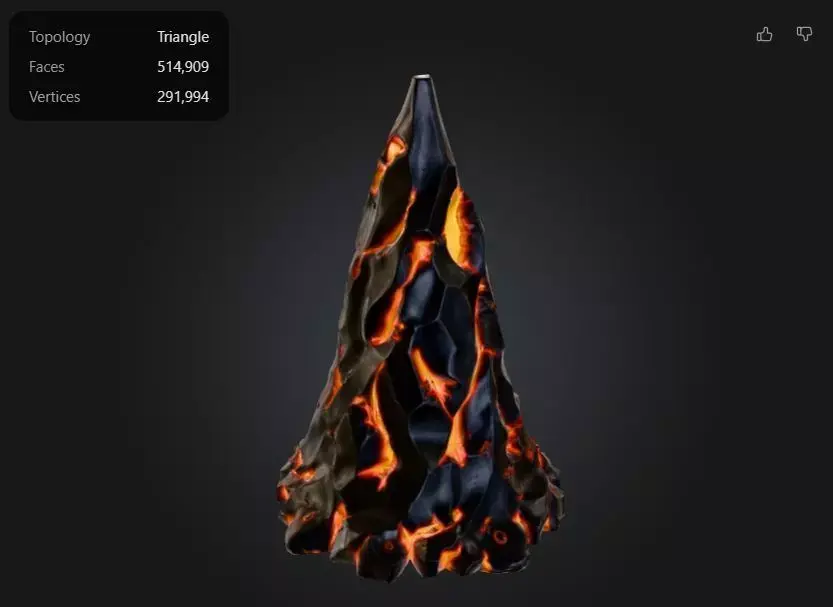 Volcanic Cone – High-Poly 3D Model with Emissive Lava TextureThis dramatic cone-shaped 3D asset evokes the raw power of a volcanic eruption, featuring a rugged, cracked surface with glowing orange fissures that pulse with molten energy. Sculpted and textured using Meshy AI’s full suite of tools, the model boasts:• Topology: Triangular mesh• Faces: 514,909• Vertices: 291,994• UVs: Fully unwrapped and optimized for emissive and PBR workflows• Texture Style: Stylized lava with emissive glow and high-contrast black crust• Use Cases: Ideal for cinematic VFX, fantasy environments, game assets, or sci-fi props• Format: [Specify file format—e.g., .obj, .fbx, .glb]• Compatibility: Works seamlessly in Blender, Maya, Unreal Engine, Unity, and other major platformsThis asset is ready for high-resolution rendering or animation and can be easily integrated into world-building scenes