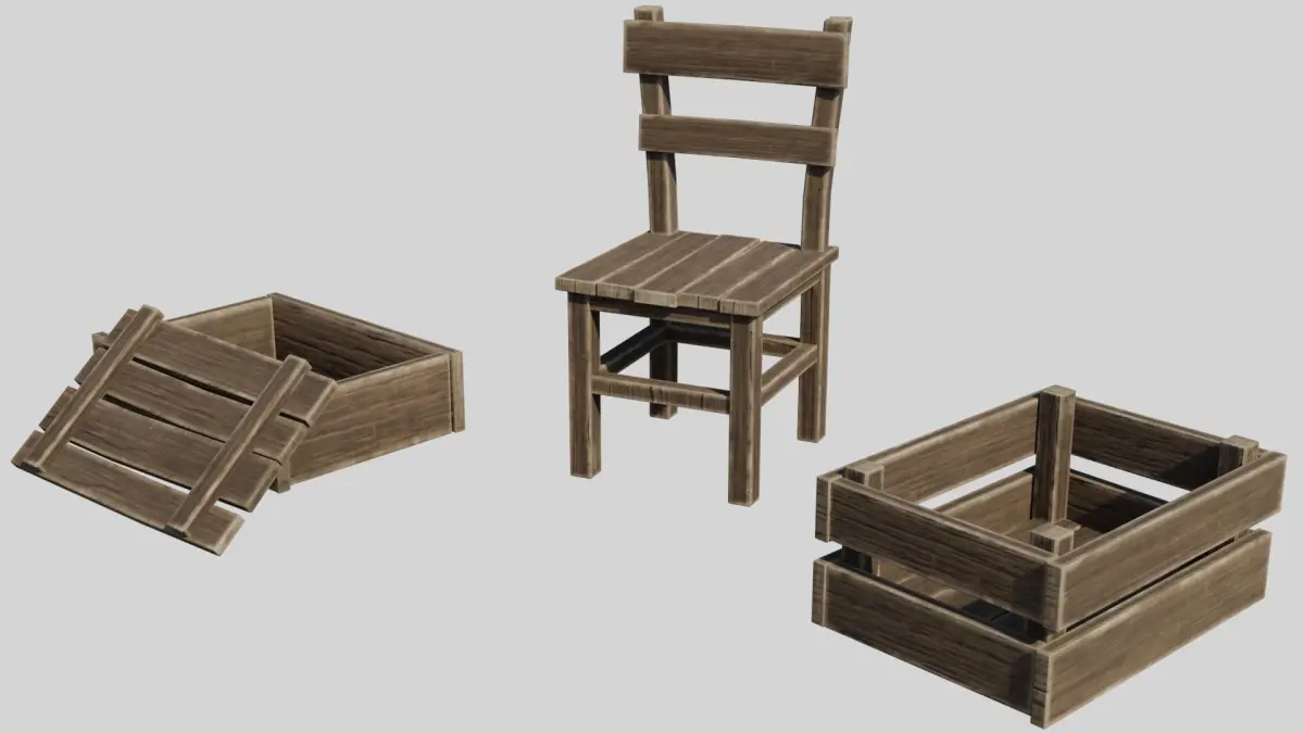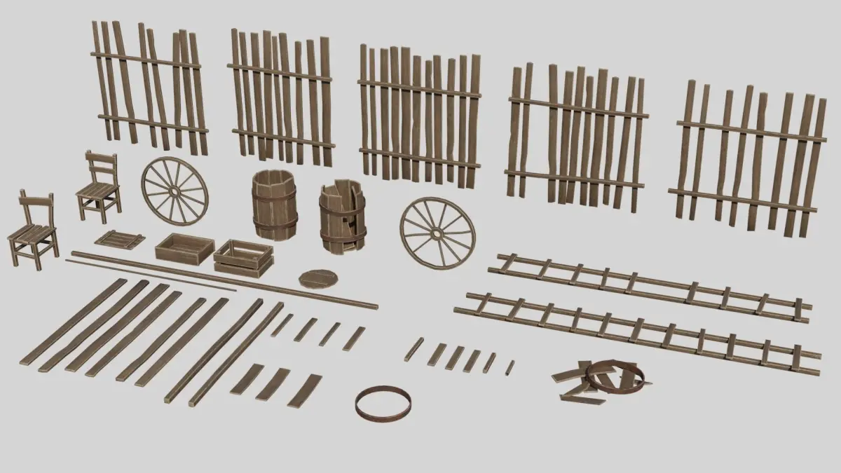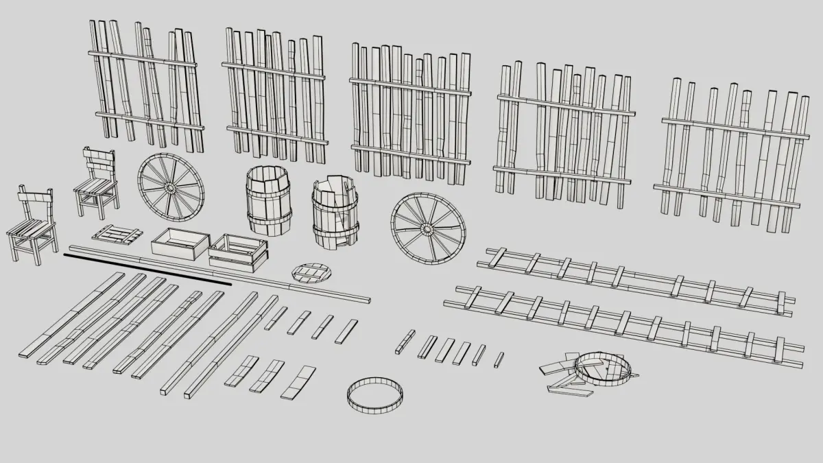 A collection of highly versatile medieval wooden props.Package contains 42 different objects : Box, barrel, wheel, chair, fence, ladder, wooden board. Low-poly construct model for gaming. Ideal for building assemblies in game engines.You can easy shift position of props or copy them to create even bigger props within minutes. Very easy to modify. All materials and textures included. It's readily available to import in Unity3D and Ue4. The example scene through included in the package.