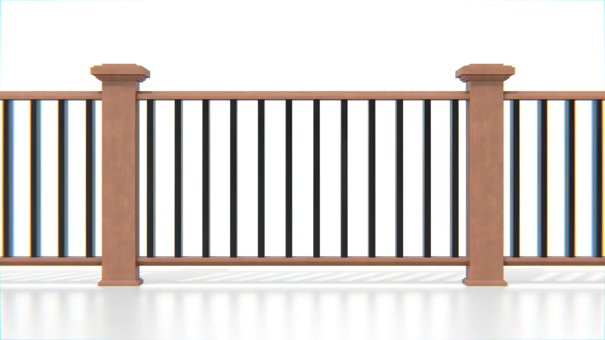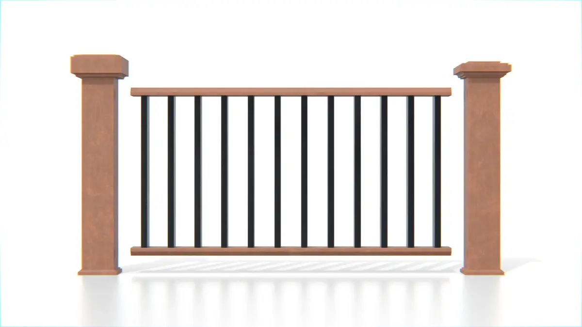 This modular railing fence features a clean wooden frame paired with evenly spaced vertical metal balusters, combining warmth and durability. The design includes squared wooden posts with decorative caps, offering both structural support and visual rhythm to the layout. Each section is modeled to allow easy repetition and connection, making it ideal for exterior decks, porches, balconies, or garden enclosures.