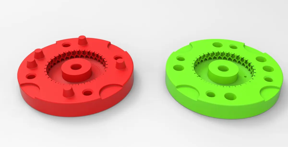 The bottom mold part has 5 special bosses and Top mold part has 5 special holes to guide mold parts in the closed state. Also, there are 4 slots for better opening with a screwdriver or similar instrument.In the Top mold part are 4 small holes for material injection.Both mold parts have 4 holes with diameter 6 mm for bolting it in closed state.Note! Only the mold! This is not a tire!
