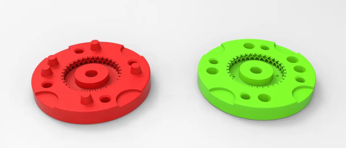 The bottom mold part has 5 special bosses and Top mold part has 5 special holes to guide mold parts in the closed state. Also, there are 4 slots for better opening with a screwdriver or similar instrument.In the Top mold part are 4 small holes for material injection.Both mold parts have 4 holes with diameter 6 mm for bolting it in closed state.Note! Only the mold! This is not a tire!