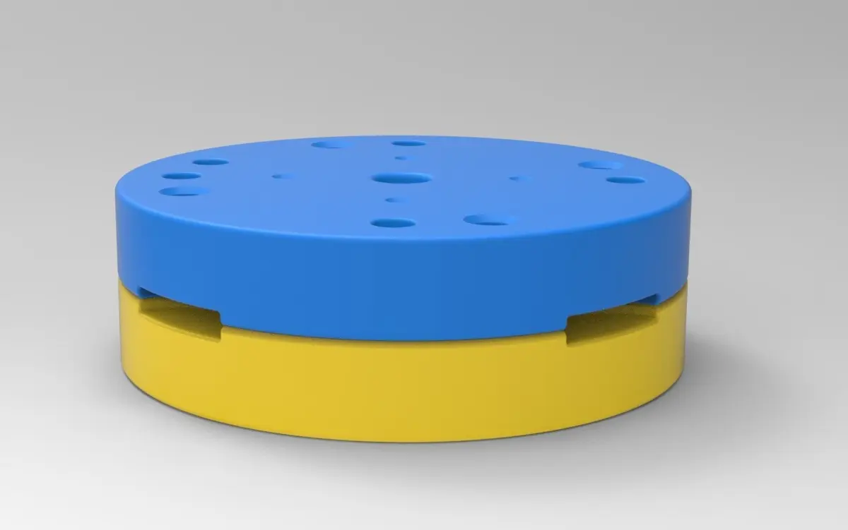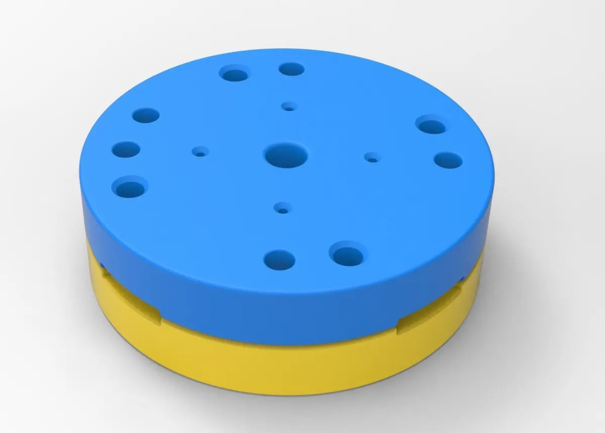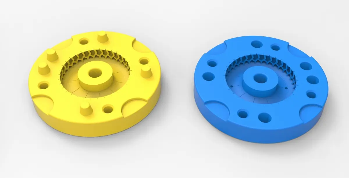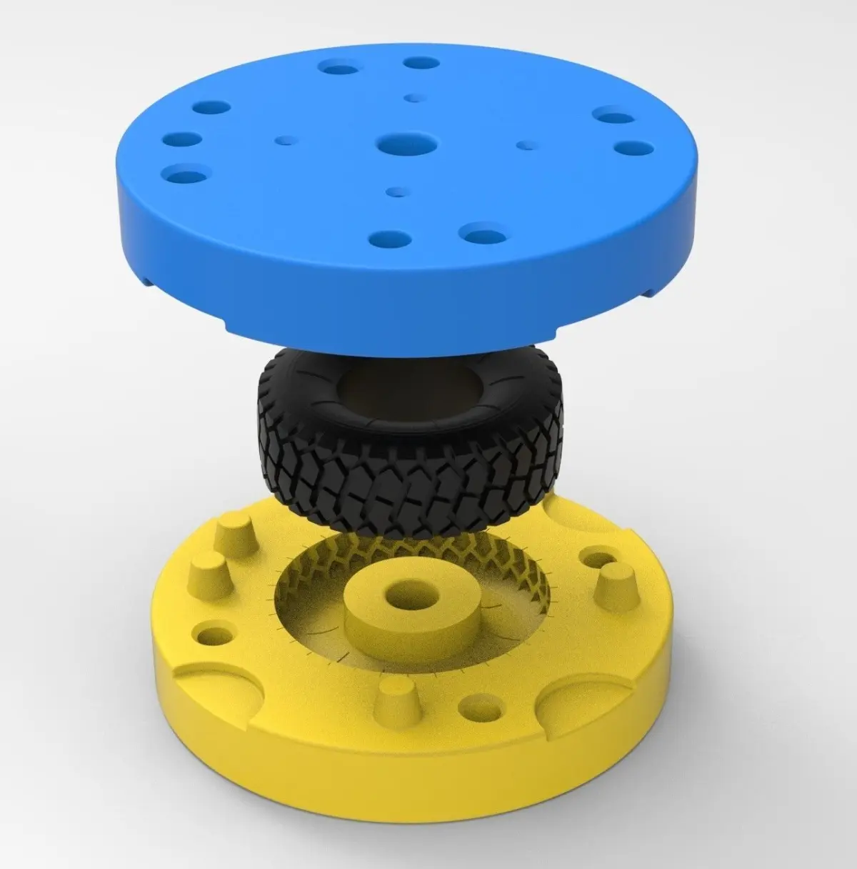 The bottom mold part has 5 special bosses and Top mold part has 5 special holes to guide mold parts in the closed state. Also, there are 4 slots for better opening with a screwdriver or similar instrument.In the Top mold part are 4 small holes for material injection.Both mold parts have 4 holes with diameter 6 mm for bolting it in closed state.Note! Only the mold! This is not a tire!