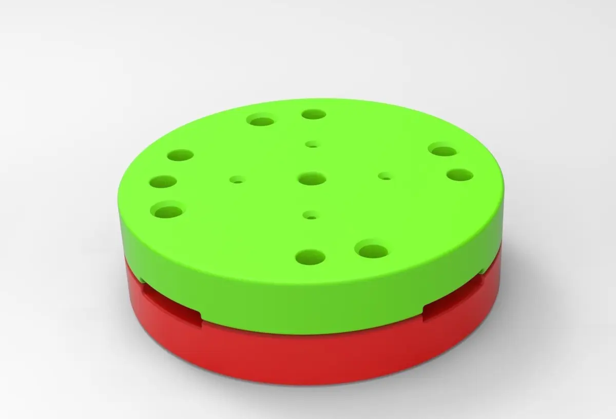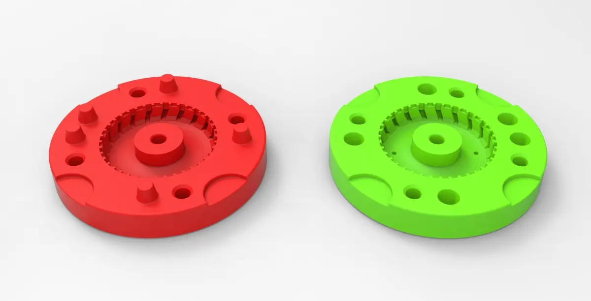 The bottom mold part has 5 special bosses and Top mold part has 5 special holes to guide mold parts in the closed state. Also, there are 4 slots for better opening with a screwdriver or similar instrument.In the Top mold part are 4 small holes for material injection.Both mold parts have 4 holes with diameter 6 mm for bolting it in closed state.Note! Only the mold! This is not a tire!