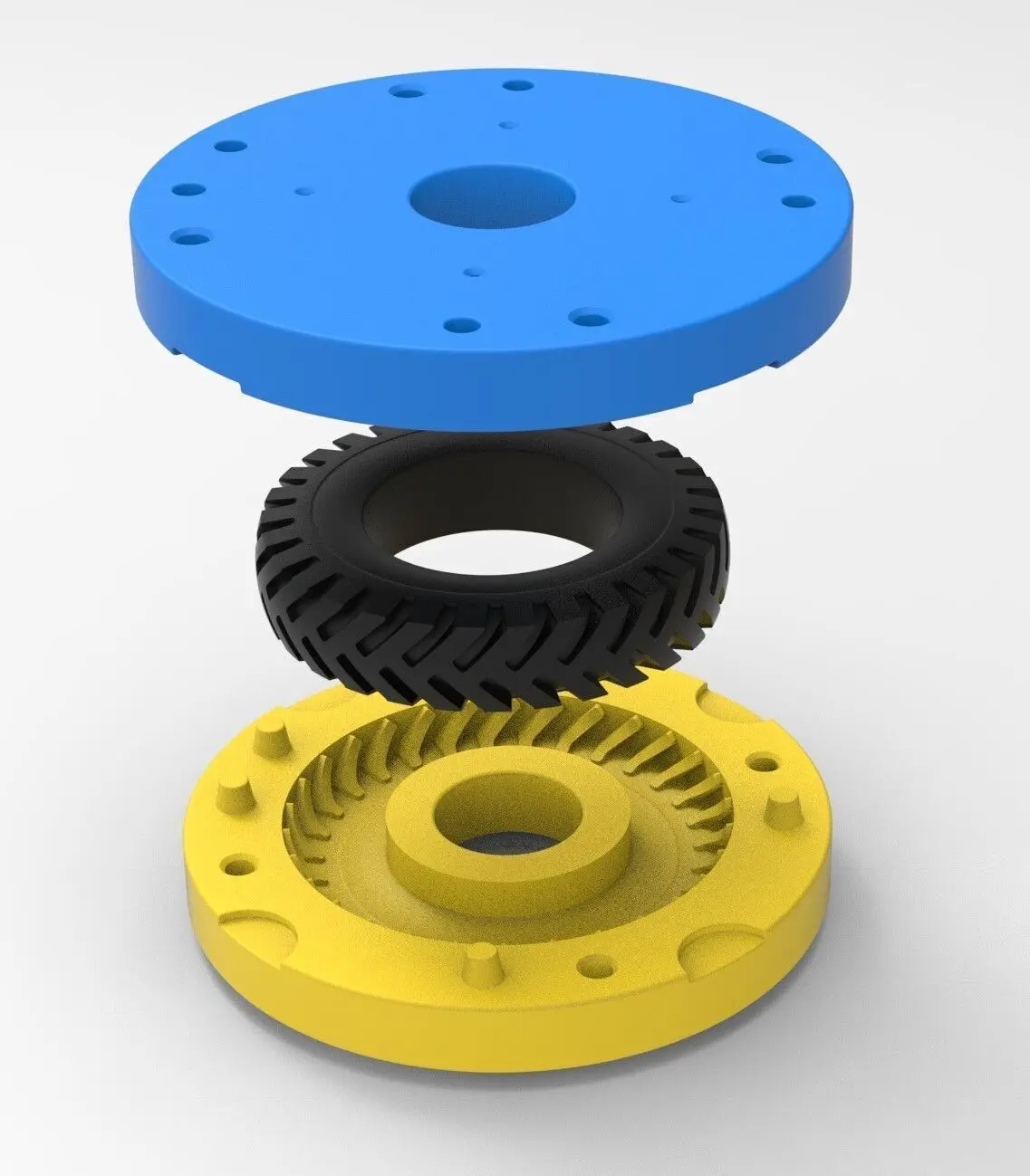The bottom mold part has 5 special bosses and Top mold part has 5 special holes to guide mold parts in the closed state. Also, there are 4 slots for better opening with a screwdriver or similar instrument.In the Top mold part are 4 small holes for material injection.Both mold parts have 4 holes with diameter 6 mm for bolting it in closed state.Note! Only the mold! This is not a tire!