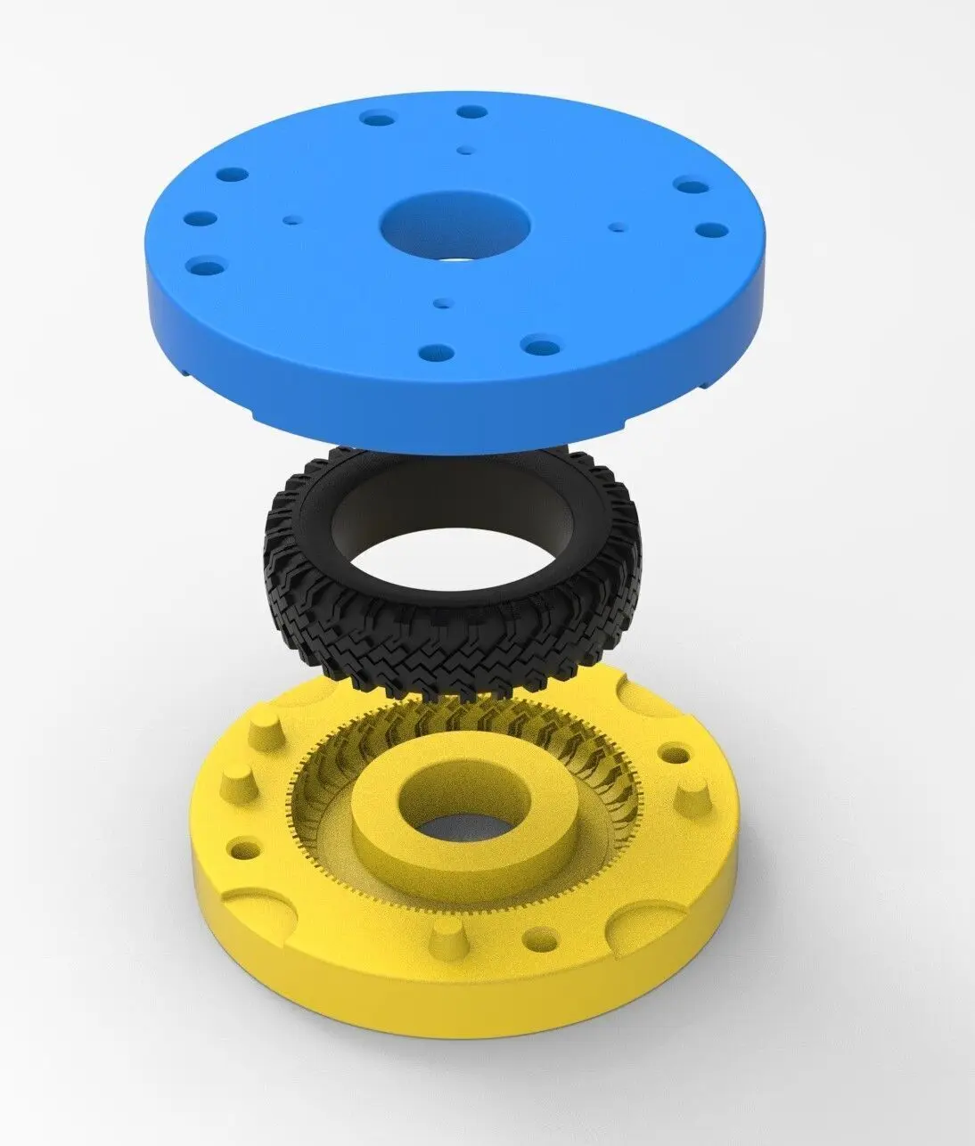 The bottom mold part has 5 special bosses and Top mold part has 5 special holes to guide mold parts in the closed state. Also, there are 4 slots for better opening with a screwdriver or similar instrument.In the Top mold part are 4 small holes for material injection.Both mold parts have 4 holes with diameter 6 mm for bolting it in closed state.Note! Only the mold! This is not a tire!