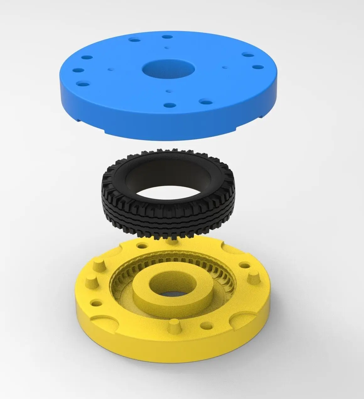 The bottom mold part has 5 special bosses and Top mold part has 5 special holes to guide mold parts in the closed state. Also, there are 4 slots for better opening with a screwdriver or similar instrument.In the Top mold part are 4 small holes for material injection.Both mold parts have 4 holes with diameter 6 mm for bolting it in closed state.Note! Only the mold! This is not a tire!