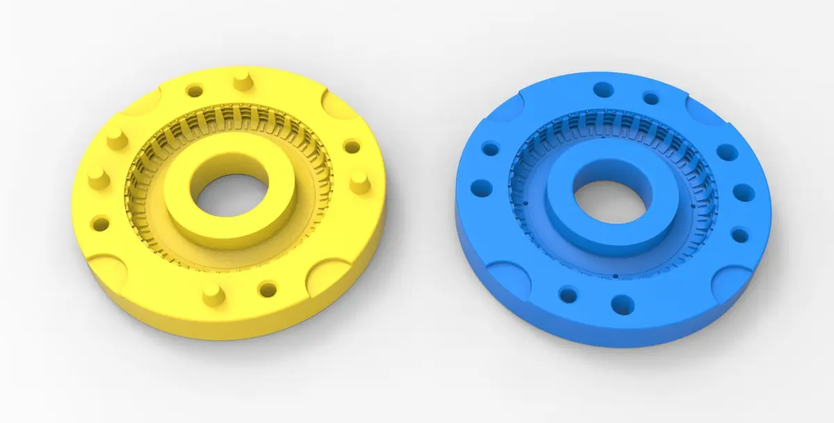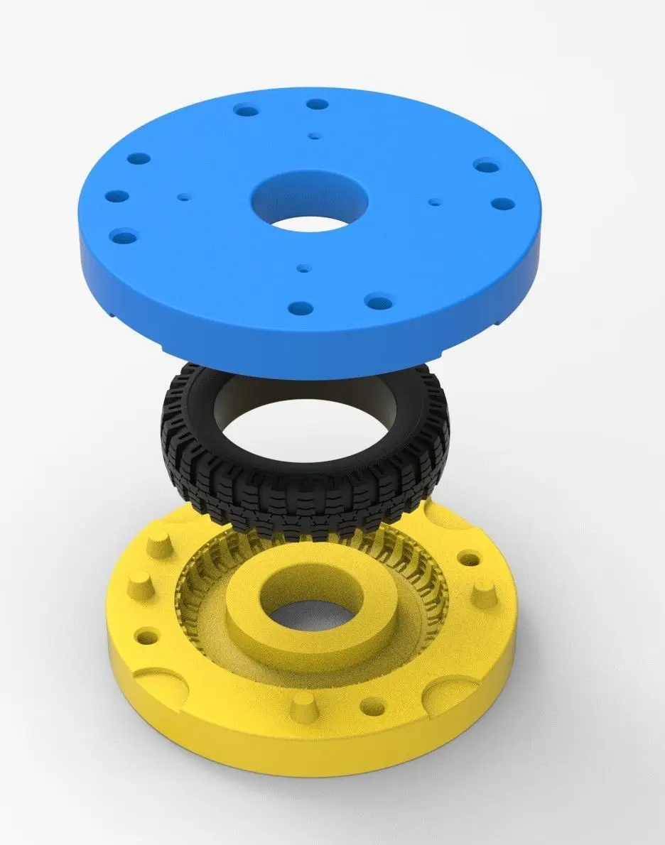 The bottom mold part has 5 special bosses and Top mold part has 5 special holes to guide mold parts in the closed state. Also, there are 4 slots for better opening with a screwdriver or similar instrument.In the Top mold part are 4 small holes for material injection.Both mold parts have 4 holes with diameter 6 mm for bolting it in closed state.Note! Only the mold! This is not a tire!
