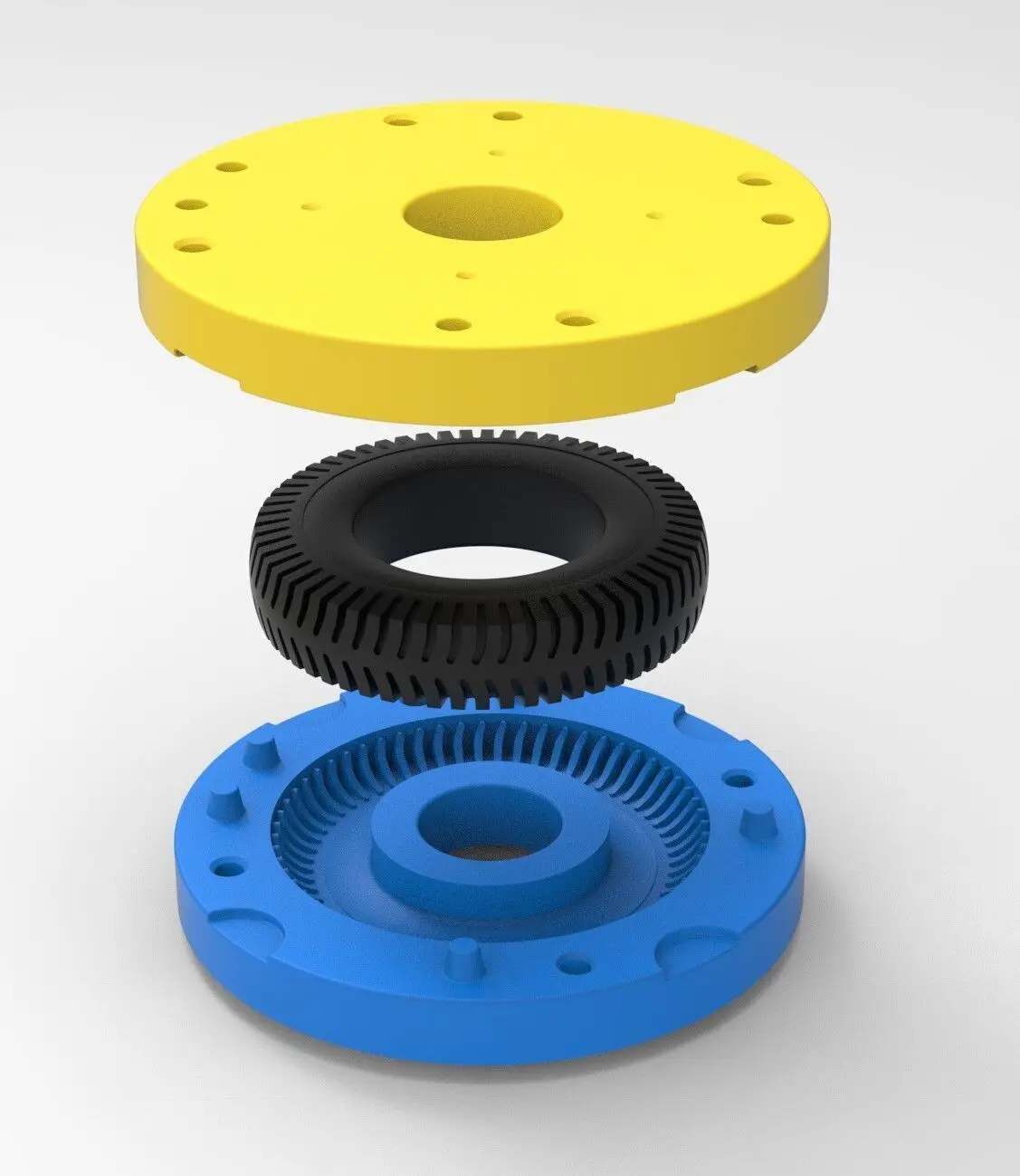 The bottom mold part has 5 special bosses and Top mold part has 5 special holes to guide mold parts in the closed state. Also, there are 4 slots for better opening with a screwdriver or similar instrument.In the Top mold part are 4 small holes for material injection.Both mold parts have 4 holes with diameter 6 mm for bolting it in closed state.Note! Only the mold! This is not a tire!