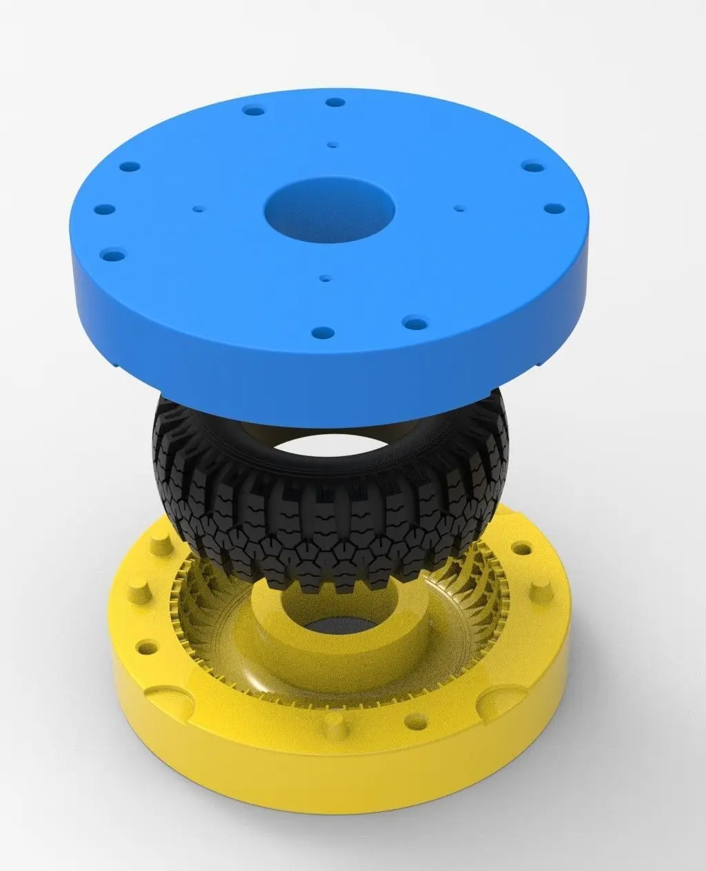 The bottom mold part has 5 special bosses and Top mold part has 5 special holes to guide mold parts in the closed state. Also, there are 4 slots for better opening with a screwdriver or similar instrument.In the Top mold part are 4 small holes for material injection.Both mold parts have 4 holes with diameter 6 mm for bolting it in closed state.Note! Only the mold! This is not a tire!